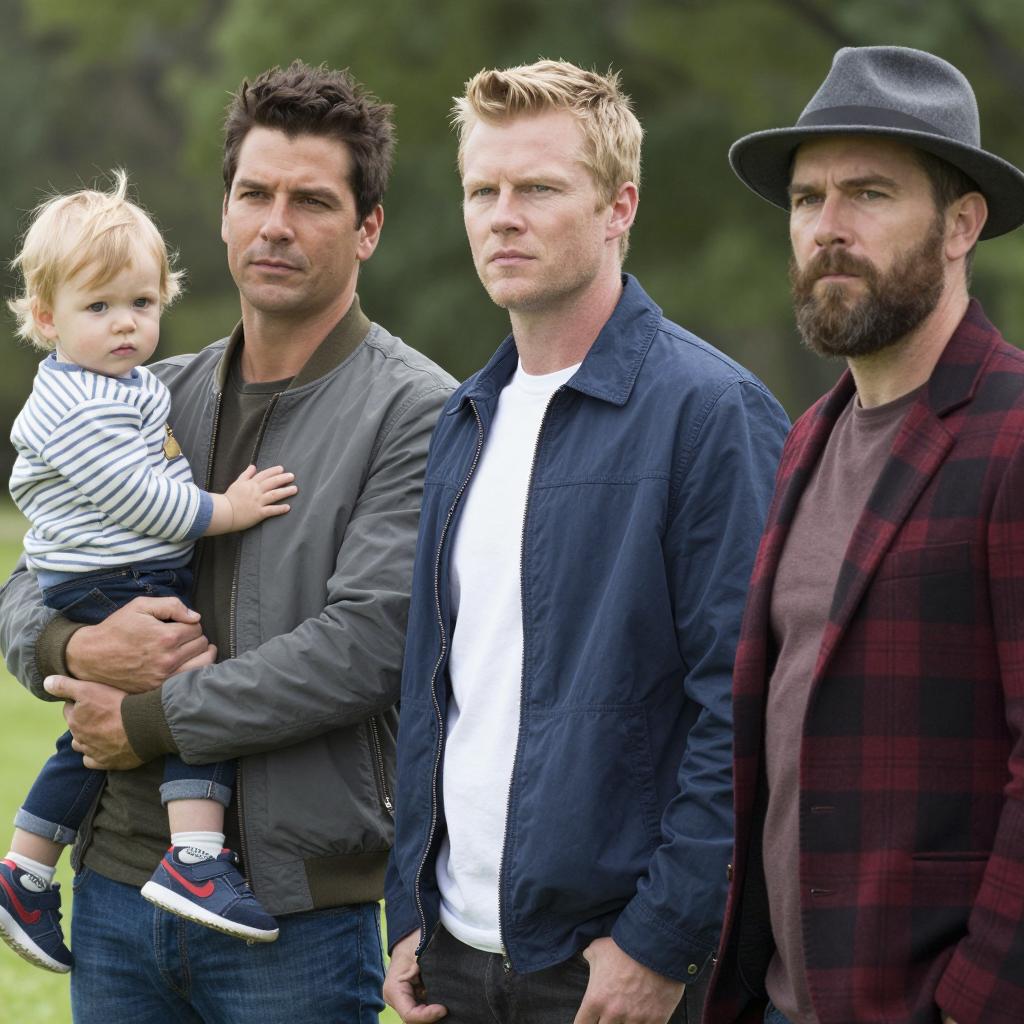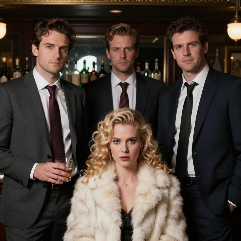 Close-up of six adults in a red convertible car. The central male driver wears a brown fedora hat and a brown leather jacket, focused on the road. A smiling blonde woman with a beige scarf is seated beside him. On the passenger side in the back seat, a man in a green military uniform and dark hat rests his hand on the car door. Two men in winter clothing occupy the rear seat, one with hand on his face and the other with brown hair. The background features out-of-focus greenery, suggesting an outdoor setting.