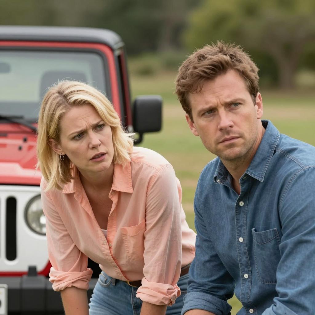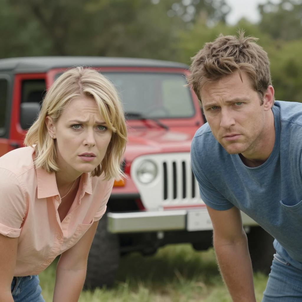 Photograph of six people in a red convertible. Driver, center, wears brown fedora and leather jacket, looking forward. Smiling blonde woman, left, leans in, beige scarf. Soldier, right, green uniform, dark hat, leans in, hand on door. Two men in background, one with hand on face, one with brown hair, wear winter clothing. Greenery in background. Driver's hand on steering wheel. Sunshade on left. Close-up.