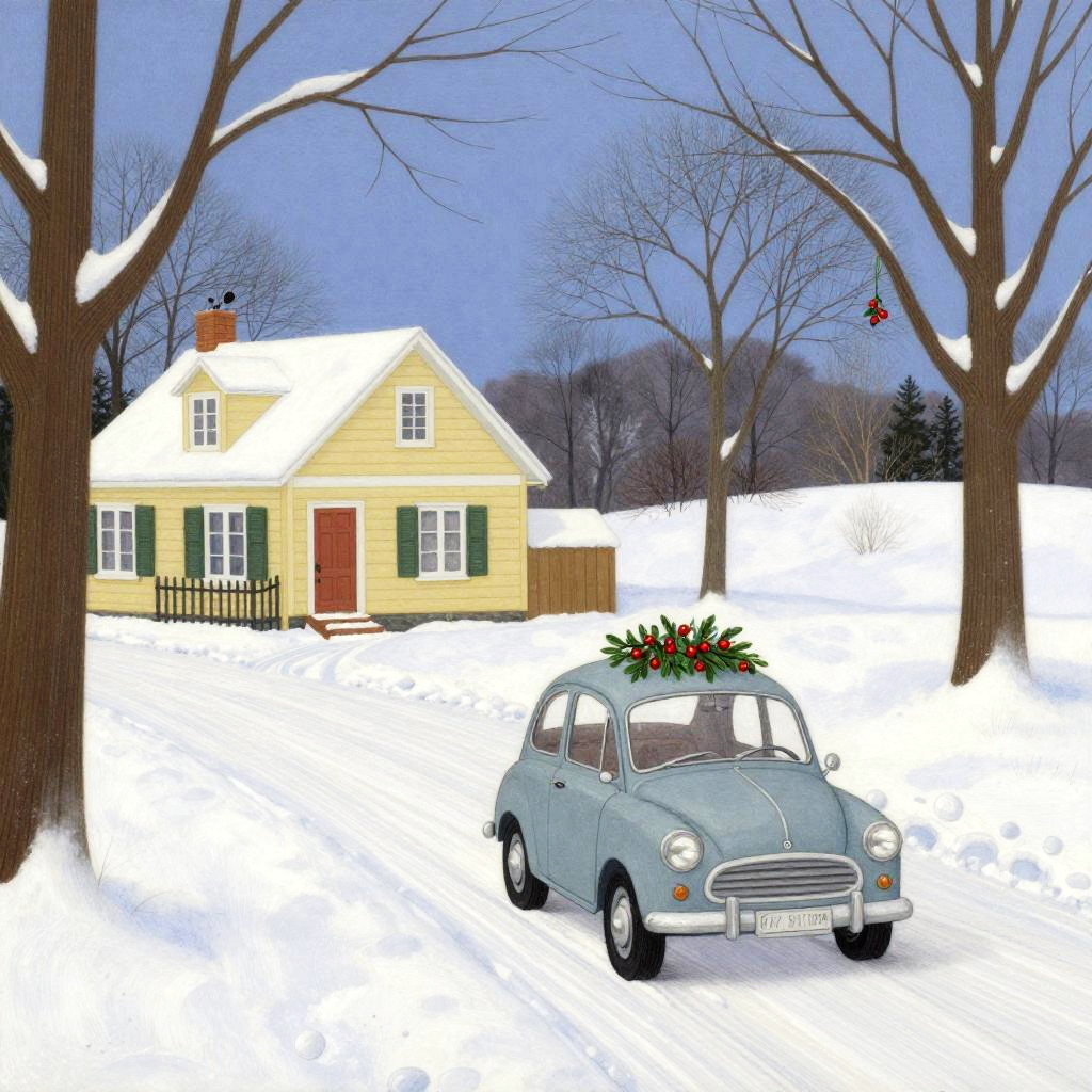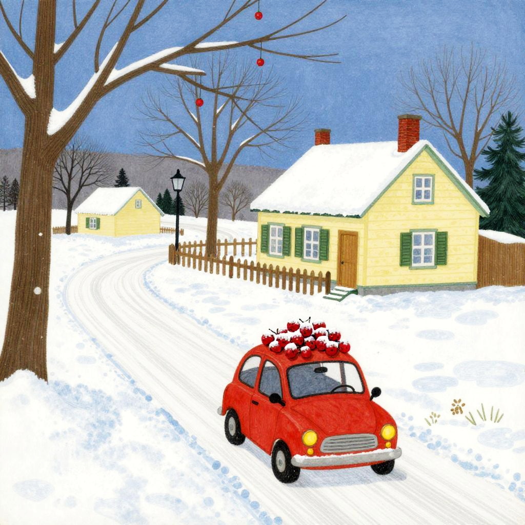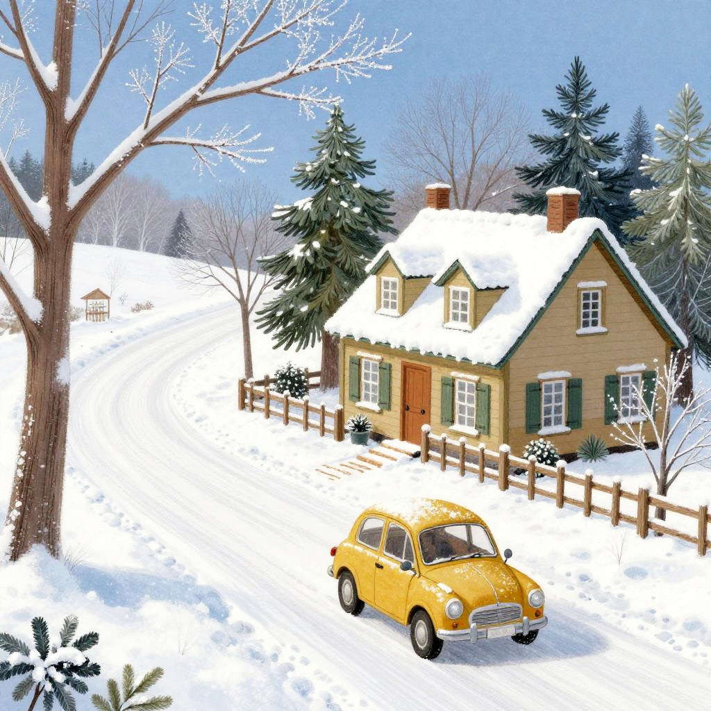 A car driving down a snow-covered road next to a house and trees with Icicles and frost on its roof, inspired by Beatrix Potter, folk art, storybook illustration, a storybook illustration