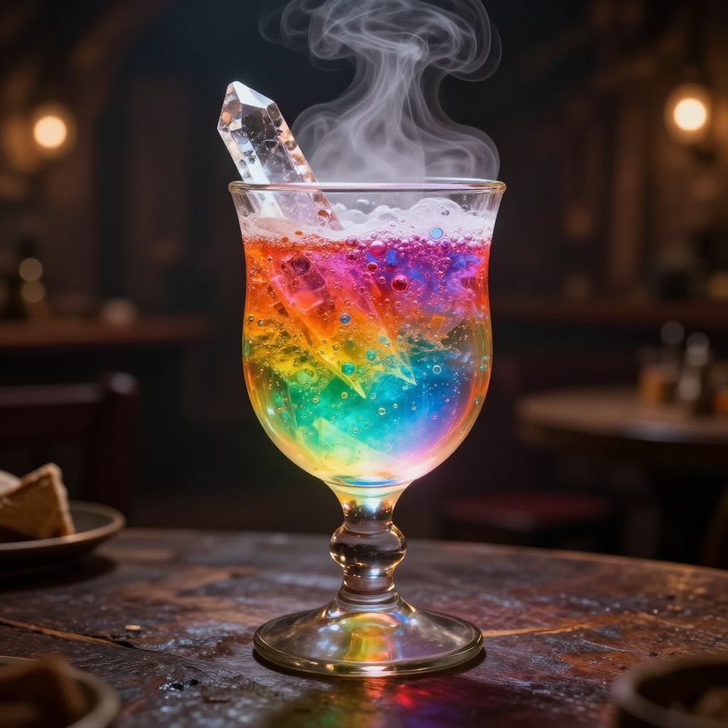 A crystal and iron goblet filled with a bubbling rainbow colored liquid, a magical glow emanates from the liquid, steam rises from the goblet, a busy fantasy tavern background, highly detailed, magical aura, intricate detail, muti-facetted, masterpiece, best quality, 8k, perfect composition, realistic, ultra sharp, perfect shadows, epic realism, photorealistic, atmospheric lighting, high realism, documentary photo, colors ablaze