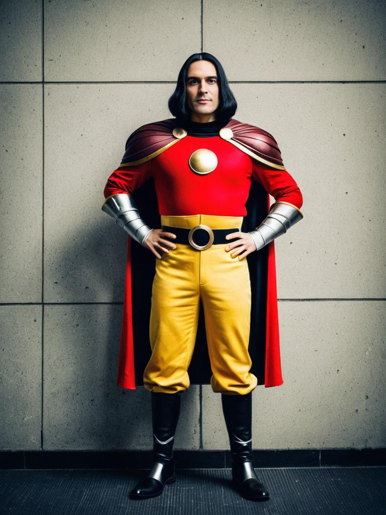 Man in Lord Farquaad costume, full-body cosplay photo, realistic style