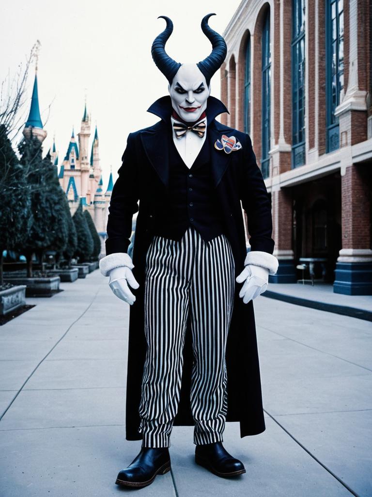 Man disney villain costume, 1boy, solo, male focus, gloves, horns, striped pants, pants, white gloves, full body, outdoors, boots, coat, standing, striped clothes, bow, bowtie, building, long sleeves