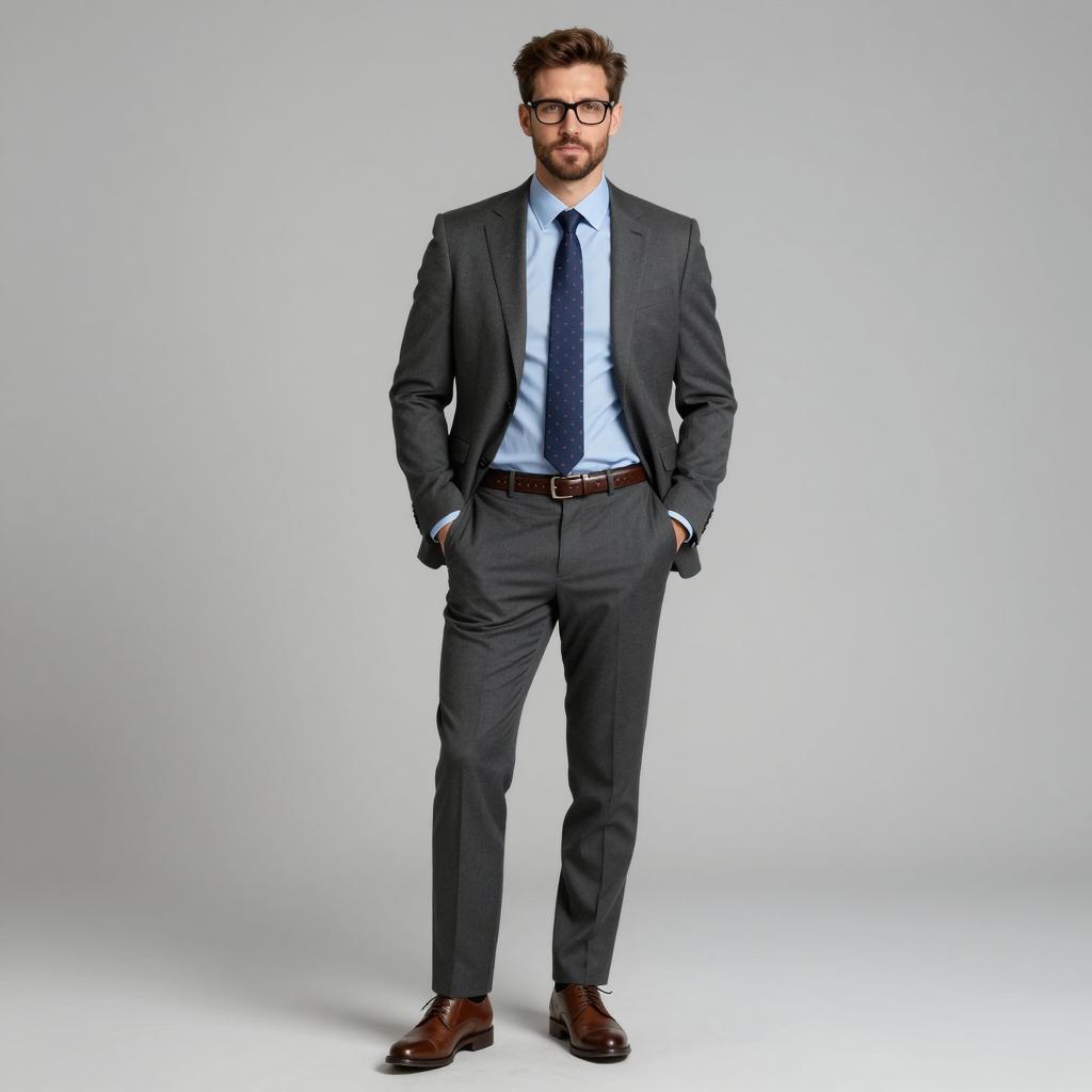 Business casual man, photorealistic, full-body portrait, male, standing, front view, wearing dark gray suit, light blue dress shirt, navy tie with small red pattern, brown leather belt with subtle pattern, brown dress shoes, hands in pockets, brown hair, short hair, trimmed beard, wearing black-framed glasses, gray background, studio lighting, formal attire, confident expression, casual stance, realistic ures, clean and polished look, minimal shadows, contemporary style, business professional, detailed clothing ures, subtle color contrast