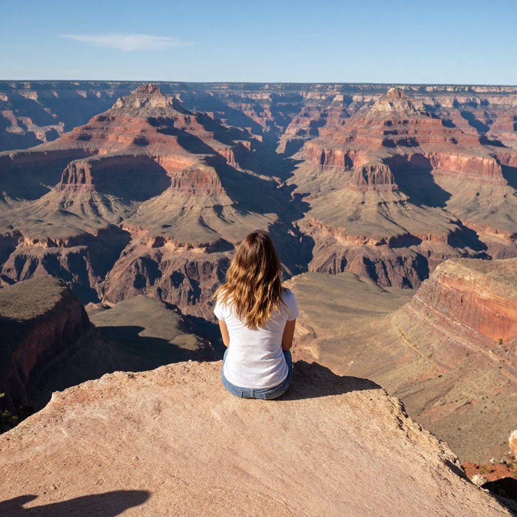 Photograph of a woman with brown hair in a white shirt, sitting on a rocky cliff, gazing at Grand Canyon's vast, colorful, layered