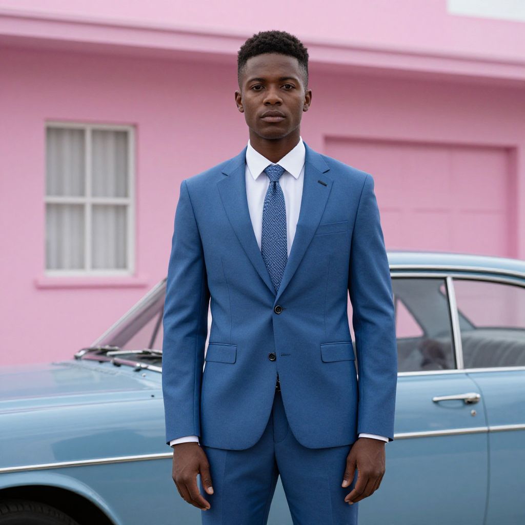 A stylish man in a sharp blue suit stands confidently in front of a vibrant pink building and a classic car, exuding an artistic vibe reminiscent of conceptual fashion photography.