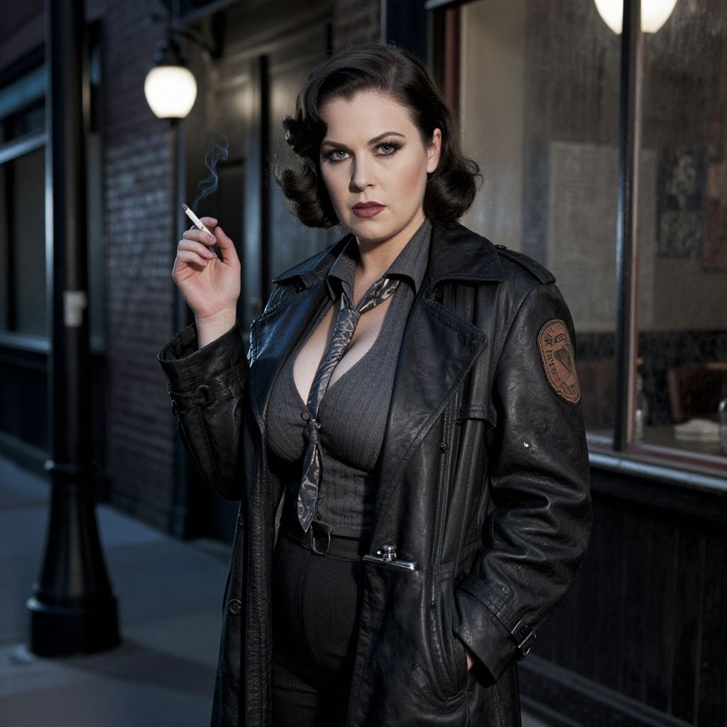 Realistic photograph of a gritty 1930s detective woman in her early 40s with a sharp, cold-eyed gaze and a strong oval face, wearing a dark leather trench coat with a worn patch on the left sleeve, standing outside a vintage jazz bar in Chicago, 1930s, with soft streetlights casting long shadows, a flask in her pocket, noir style with moody blue and gray tones, cigarette in one hand.. The woman has big tits and cute face