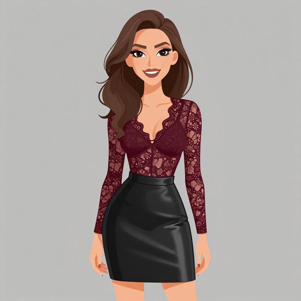 Woman with pretty face and pretty hair. smiling Woman, chic, black spaghetti strap top with a plunging neckline, fitted lace pencil skirt with a centered slit, gold cuff bracelet on her wrist. --sref 1467