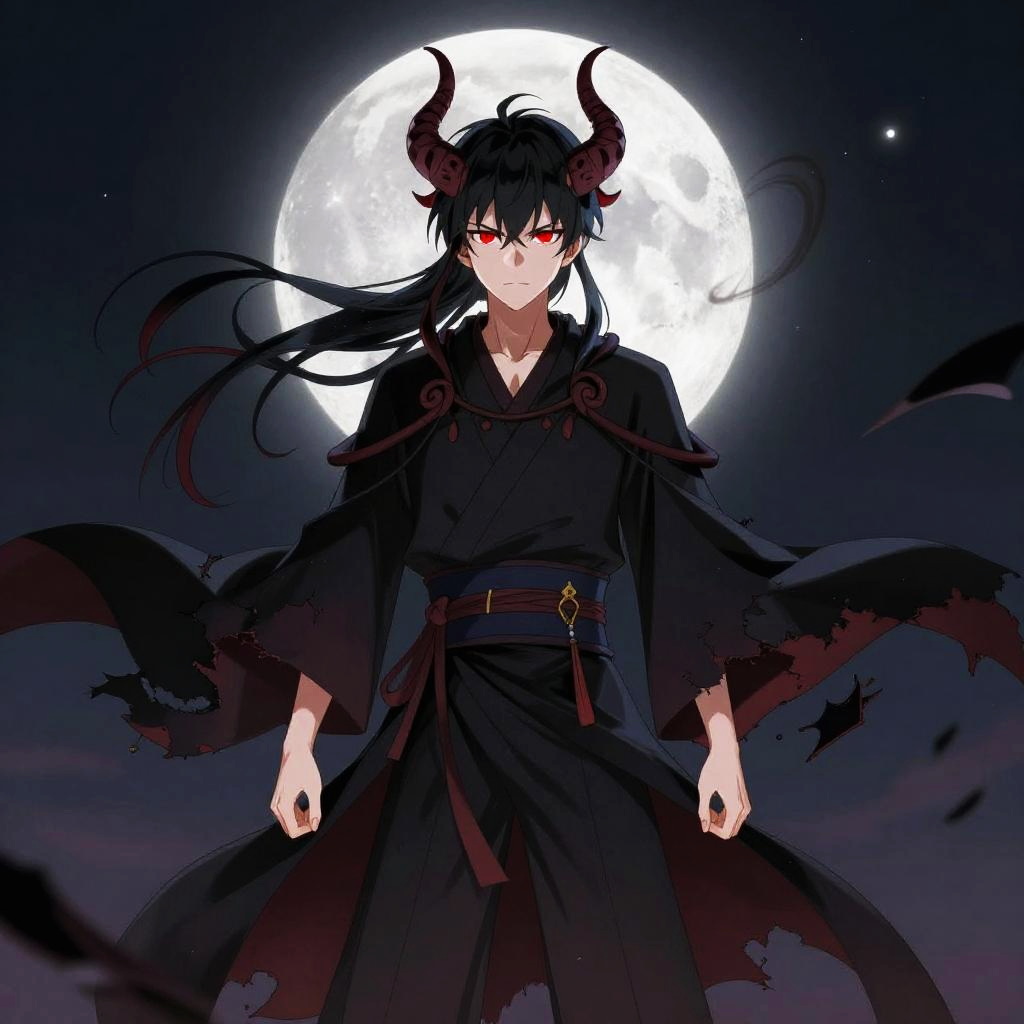 Black hair anime demon boy standing under a glowing full moon, sharp red eyes, intricate horn designs, dark swirling aura around, tattered cloak fluttering in the wind, detailed anime style with vibrant colors and dramatic shadows.