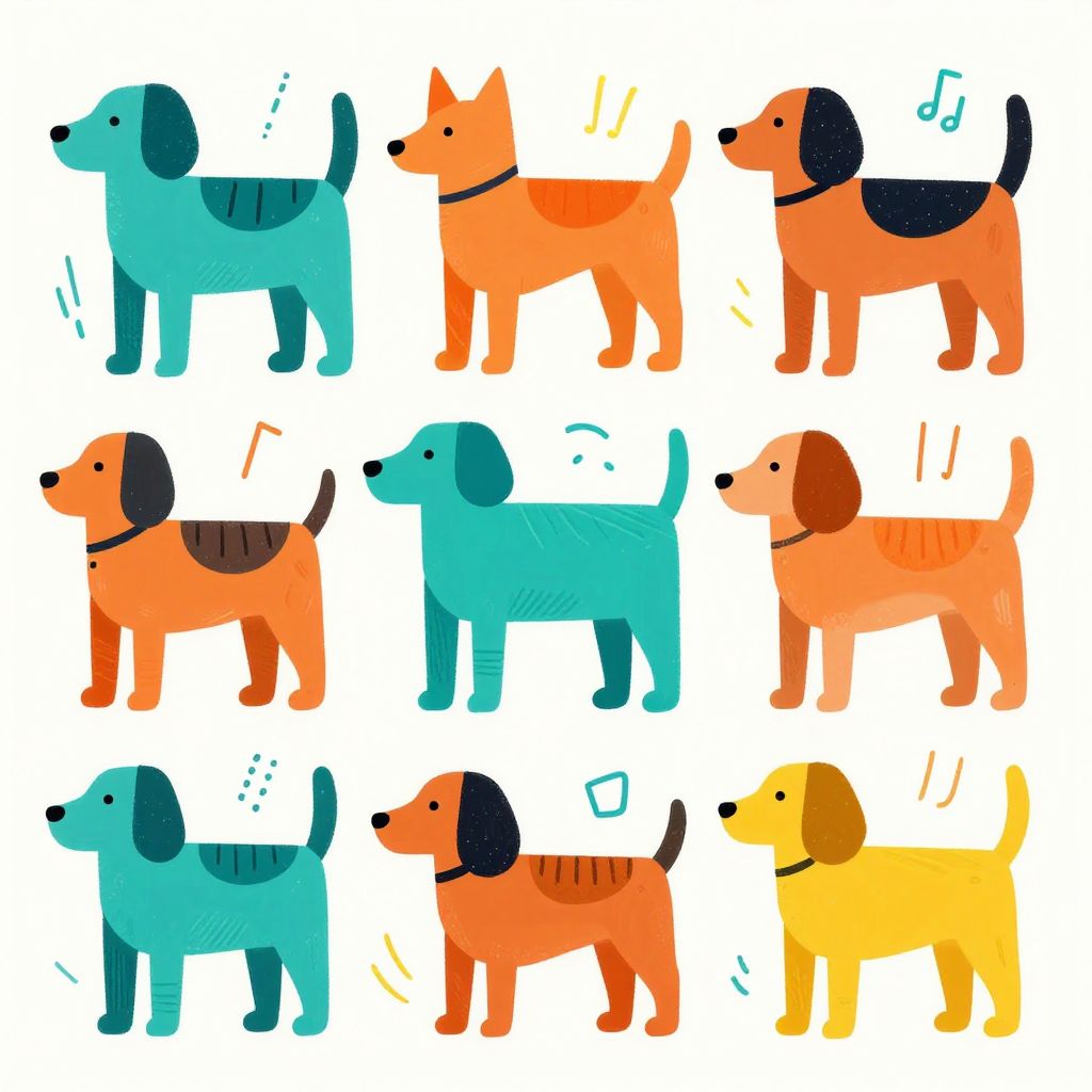 This digital illustration features nine cartoon-style dogs arranged in a 3x3 grid against a white background. The dogs are brightly colored in shades of blue, orange, and yellow with black ears and tails. Each dog has a distinct pattern, such as stripes or spots, and some have musical notes near them, suggesting they are barking. The dogs are simple, with minimalistic features like small black noses and eyes. The overall style is playful and child-friendly, with a focus on vivid colors and bold shapes. The illustration has a clean, modern look with a flat design aesthetic.