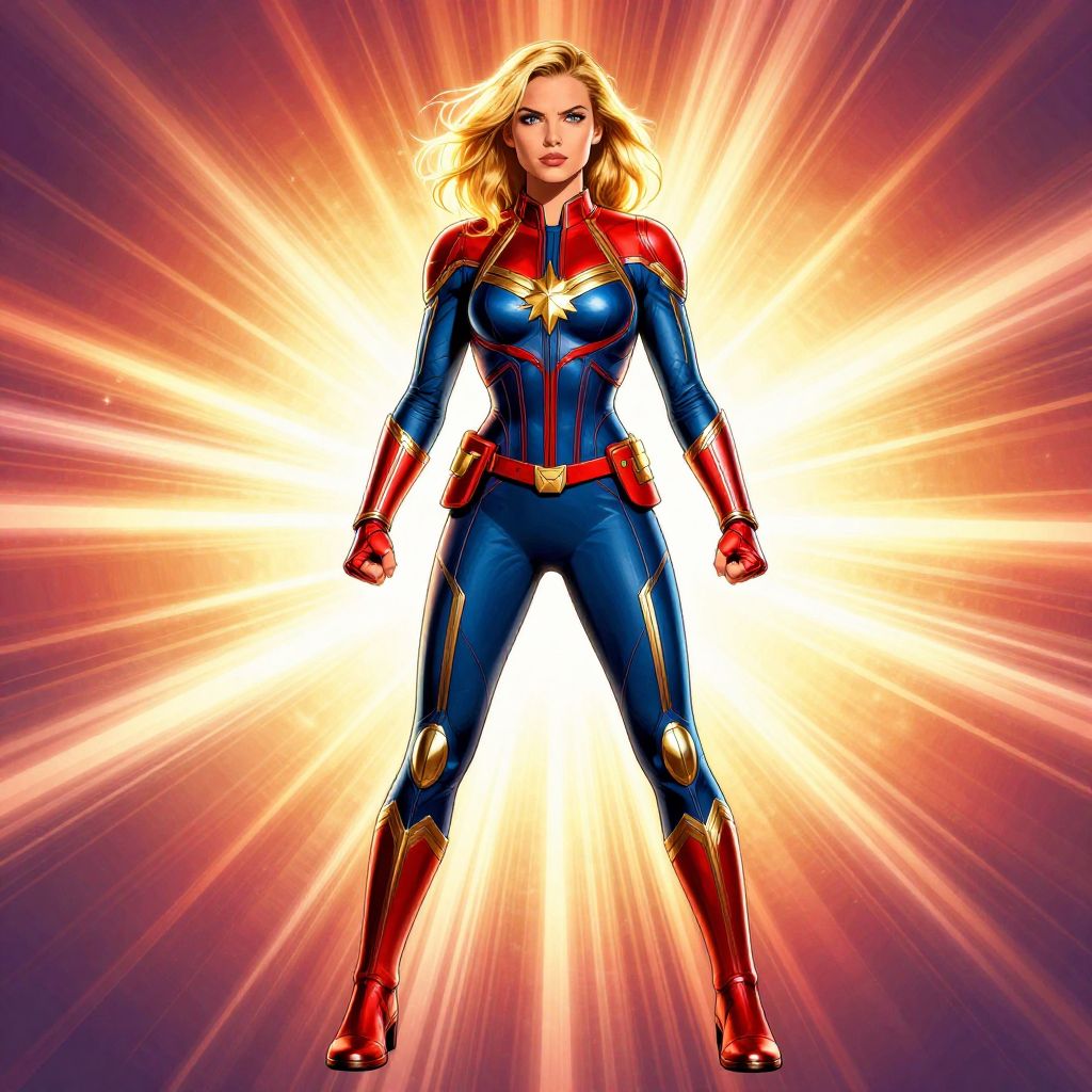 Illustration of a female superhero in tight red, blue, and gold armor resembling Captain Marvel, with blonde hair. The full-body artwork features high contrast, vivid colors, rim lighting, and a radial light burst background. The character is depicted in a confident, symmetrical stance with clenched fists, inspired by comic book cover art style.