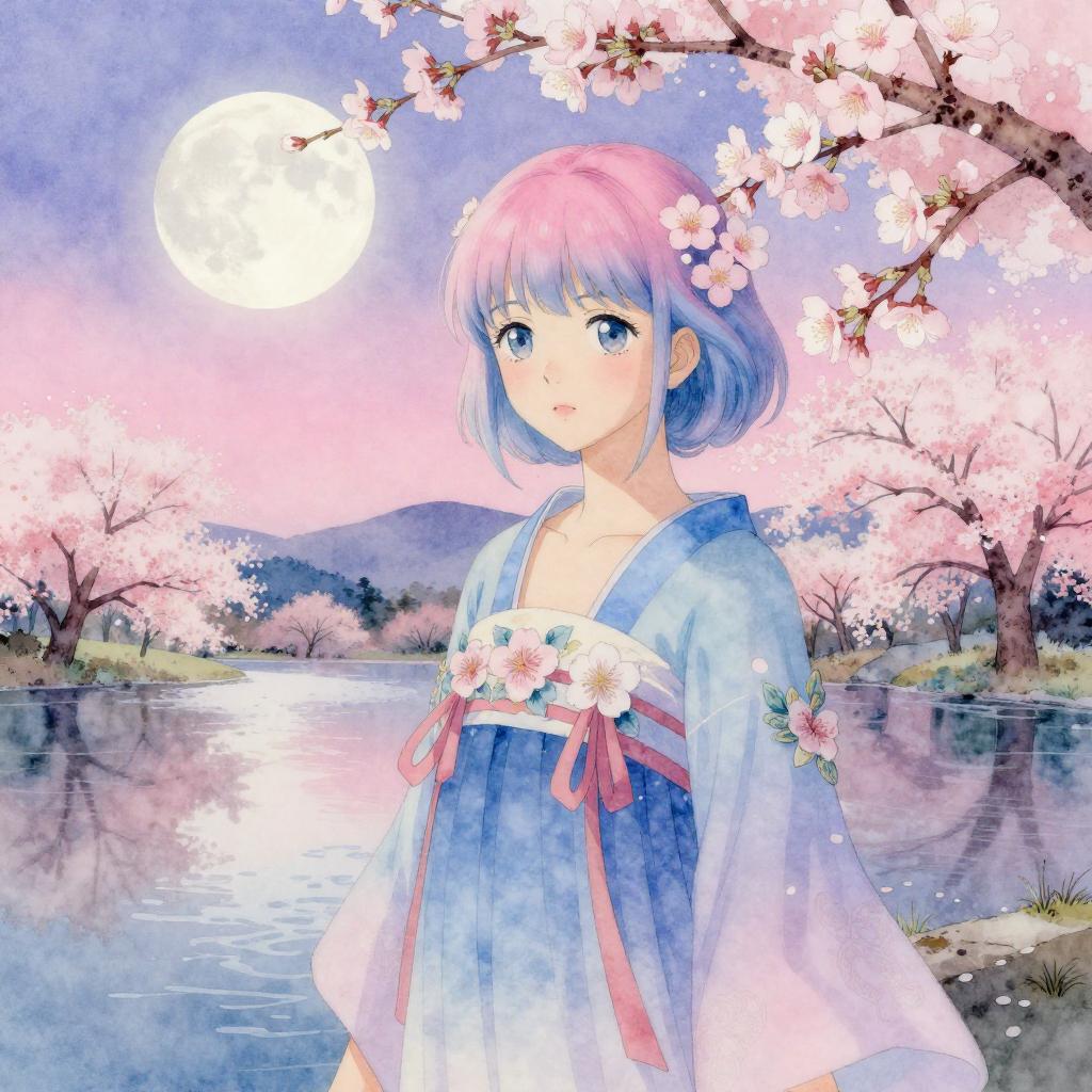 Digital artwork of a young woman with powder blue hair adorned with cherry blossoms, set against a serene mystical landscape featuring a large white moon, pink and lavender gradient sky, and cherry blossom trees by a calm lake. The woman has expressive eyes, wearing a blue and lavender gradient dress decorated with floral elements. The style is inspired by Taro Okamoto and watercolor painting techniques.