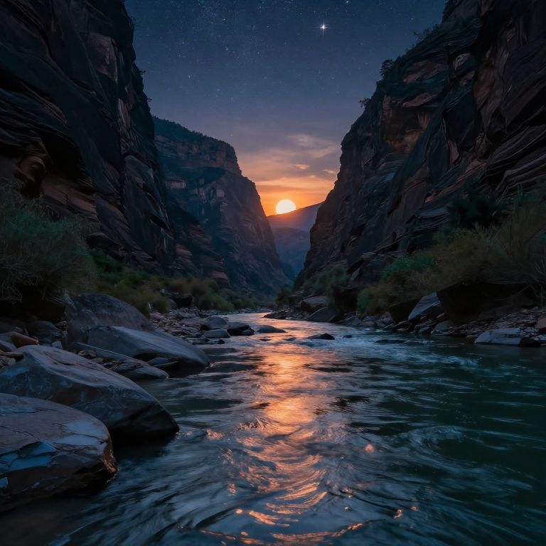 A tranquil river bathed in celestial light flows through a majestic canyon, its surface shimmering with reflections of distant stars and a setting sun that defies the normal progression of day into night.
