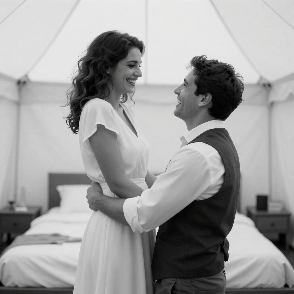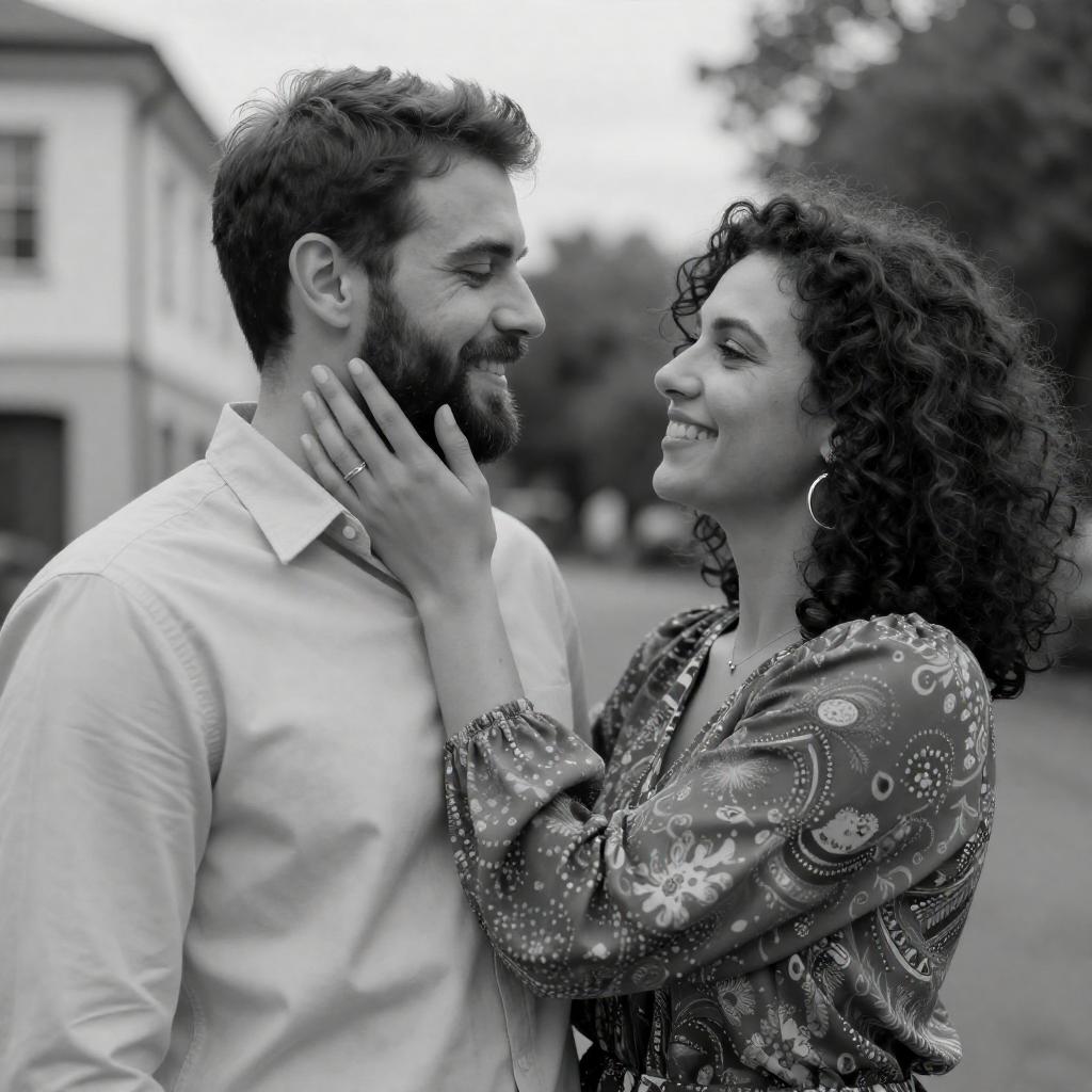Black-and-white photograph of a smiling couple standing outdoors. The man, with a beard and short hair, wears a light shirt. The woman, with curly hair and large earrings, wears a patterned blouse with puffed sleeves. She gently touches his face. Background includes a blurred building and trees.