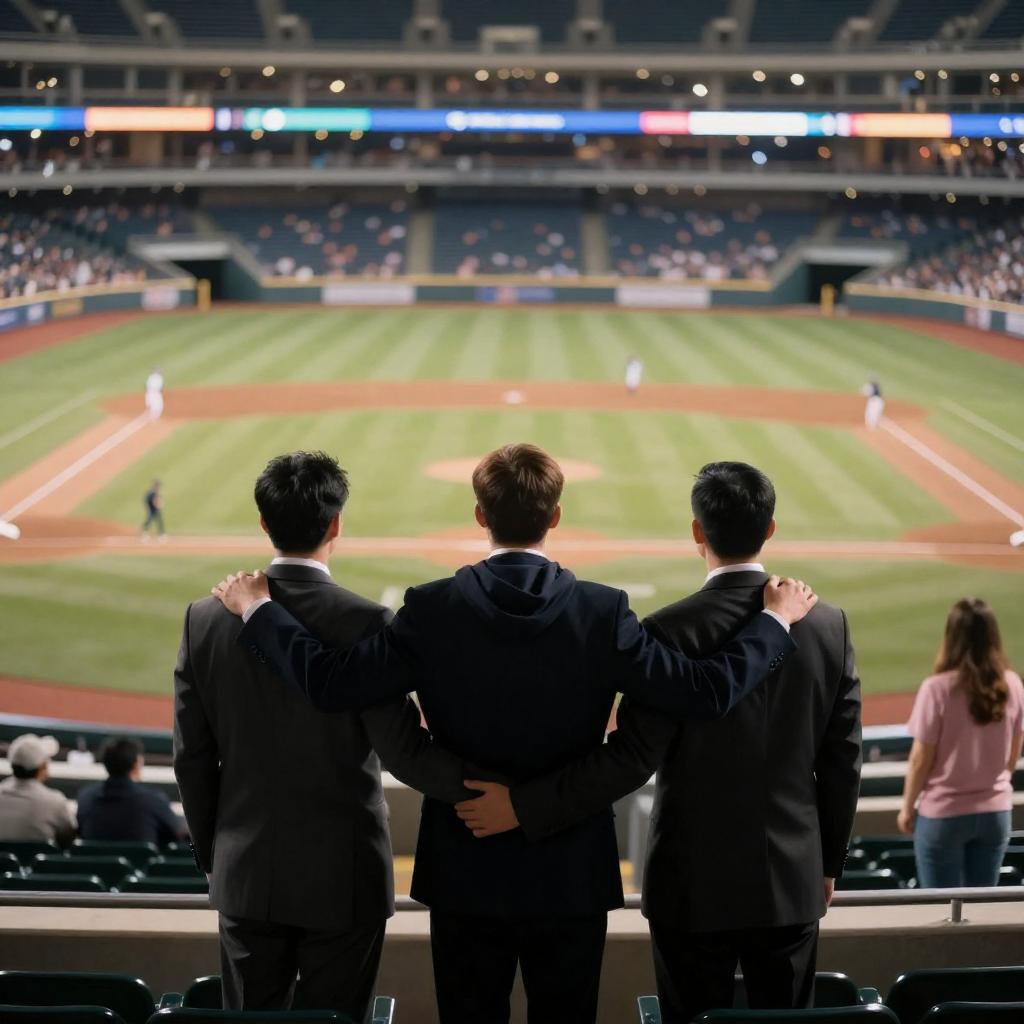 Photograph of three men standing with arms around each other's shoulders, facing a brightly lit baseball field. The men wear suits; one in a hooded jacket. Field with players, green grass, and brown dirt. Stadium seats filled with spectators. Blurred light effects around edges. One woman in pink stands to the right.