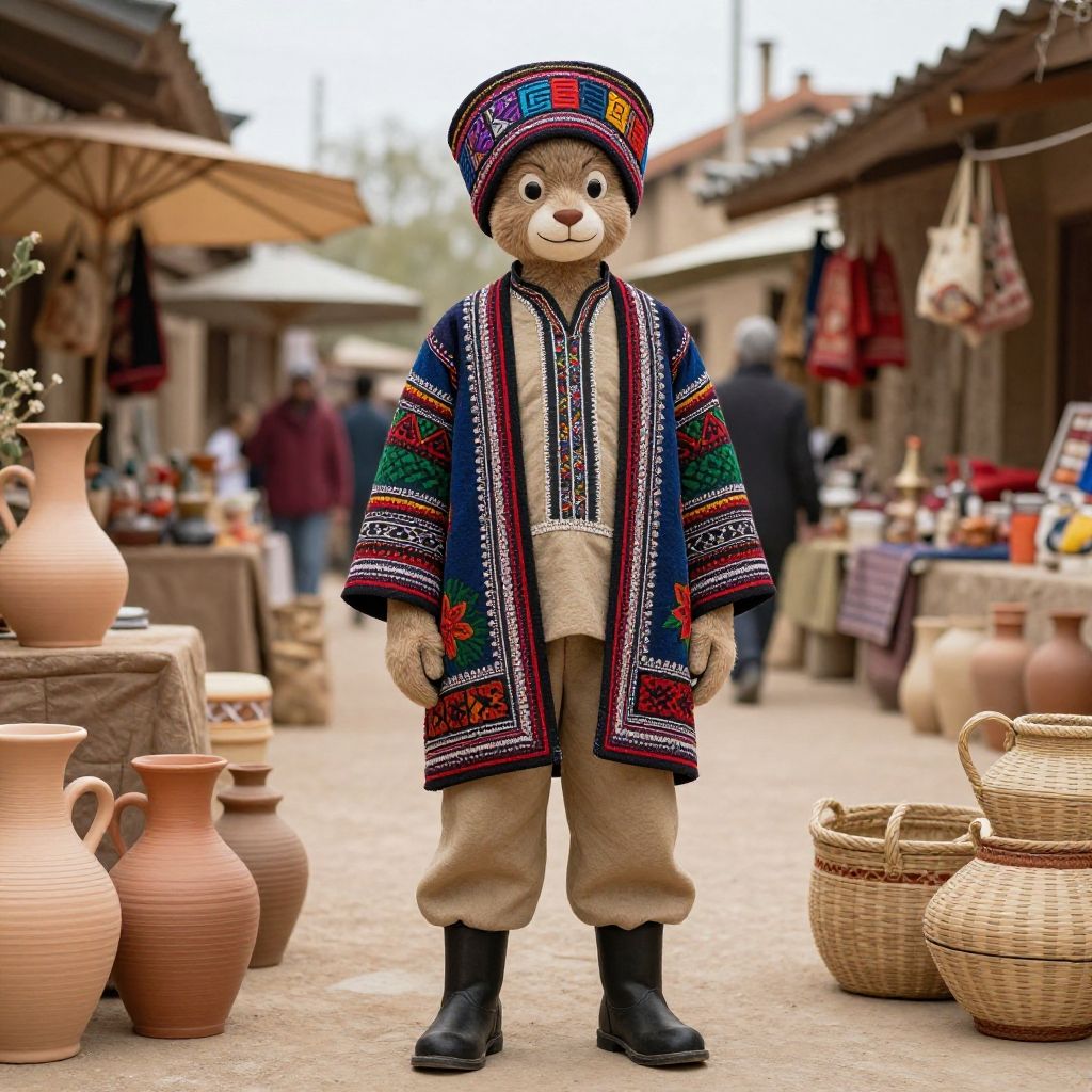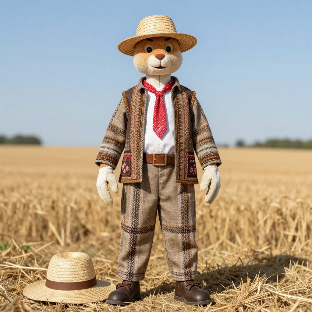 Beaner costume showcasing a blend of natural textures such as burlap and linen, adorned with tiny bean seed beads and straw accents, portrayed on a character harvesting beans in a sunlit field with a vintage wooden basket and lush greenery around.
