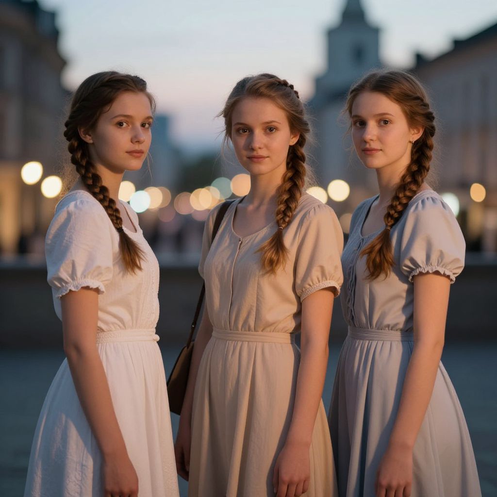 Portrait of young Slavic ladies with braided hair, wearing elegant modern dresses, soft pastel colors, urban cityscape at dusk, warm glowing lights, cinematic atmosphere