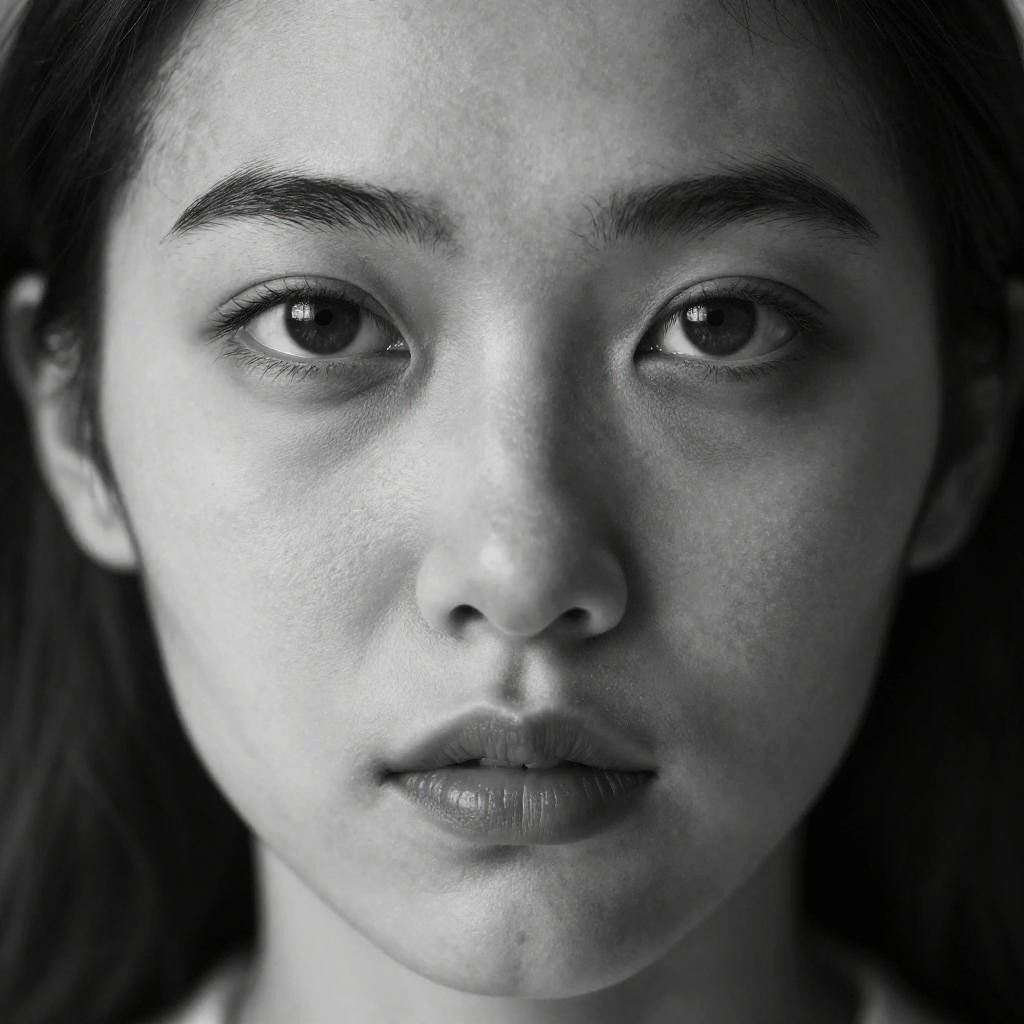 Asian girl glasses, artistic studio shot, dramatic shadows on face, large vintage frames, high fashion look, monochrome background, intense gaze and bold lips