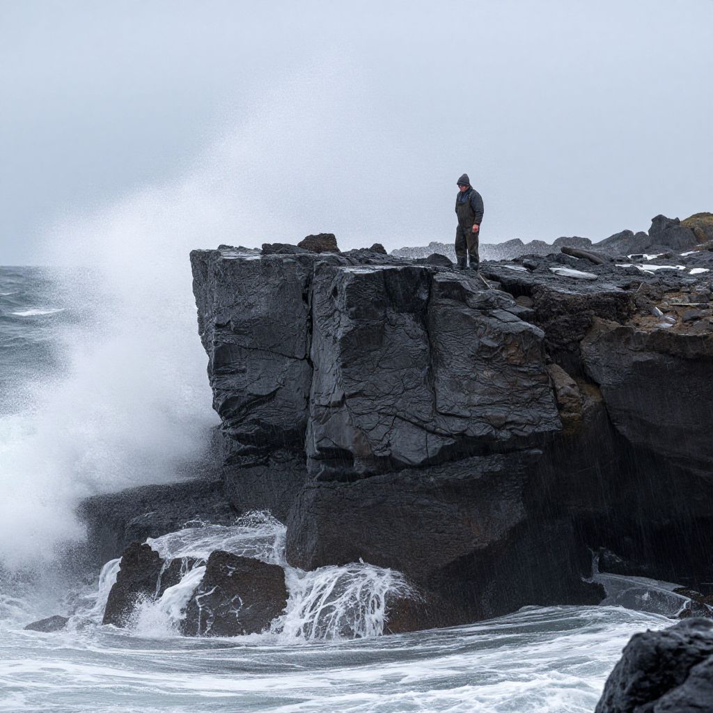 An isolated outcrop of volcanic rock forming a natural cliff face in a remote coastal region, surrounded by crashing waves and sea spray, with a fisherman in a woolen hat and oil-stained overalls standing at the edge, his face half-shaded by rain and wind.
