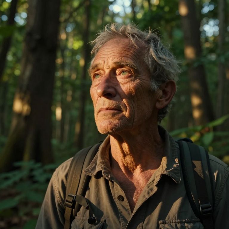 Photograph of an older man with weathered face, gray hair, and brown shirt, standing in a sunlit forest, looking upward. Photographer watermark