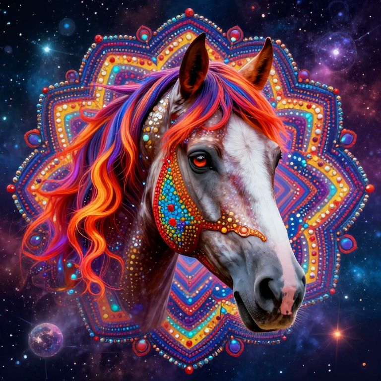 A kaleidoscopic horse head emerges from a vibrant, polka-dotted mandala, its mane ablaze with fiery hues and its gaze piercing through a dreamlike, bead-embellished cosmos.