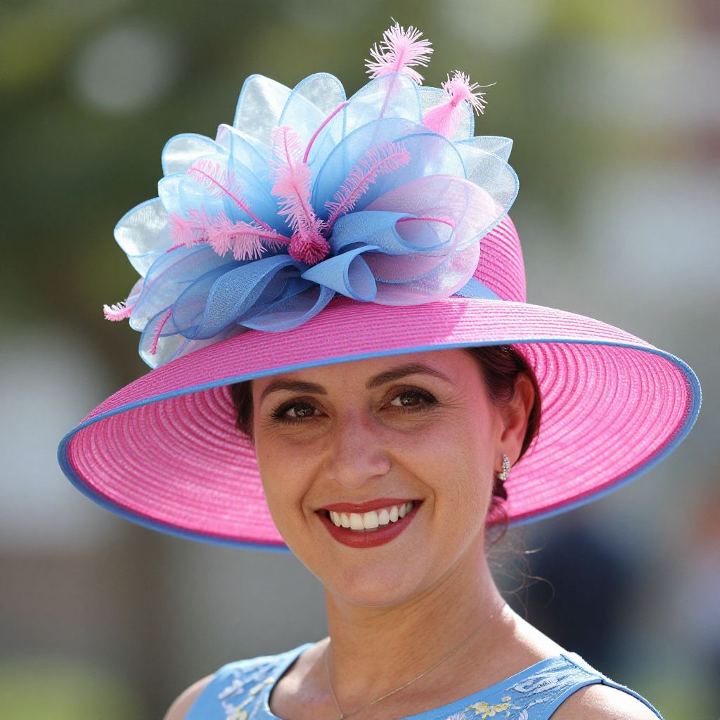 Photograph of a smiling woman with fair skin and red lipstick, wearing a bright pink wide-brimmed hat adorned with large, light blue and white floral appliqués. She has dark brown hair and is dressed in a light blue, sleeveless top. The background is blurred, with hints of greenery, suggesting an outdoor setting. Her earrings are small and gold. The hat's vivid pink contrasts with the blue flowers, adding a playful, elegant touch to her appearance. The lighting is bright, highlighting her cheerful expression and the intricate details of her hat.