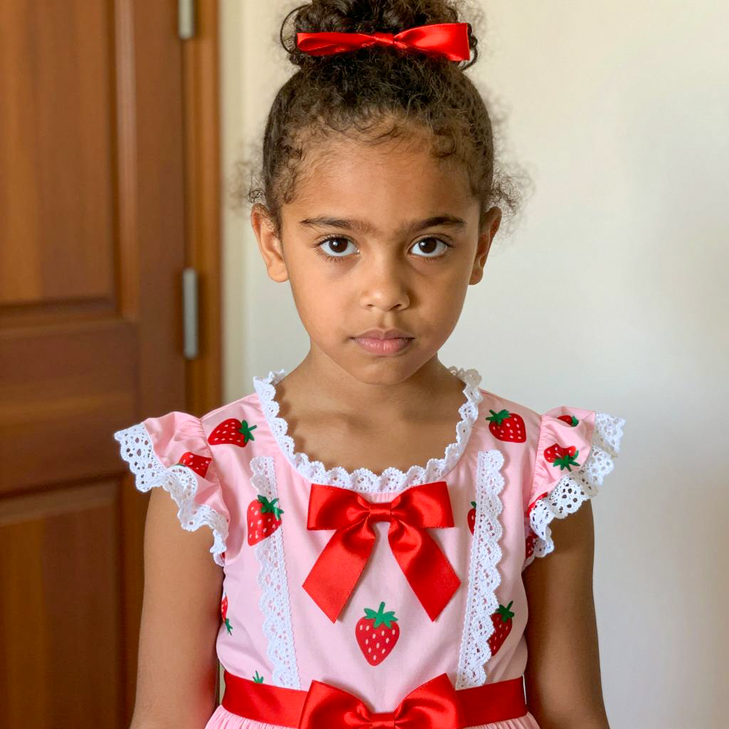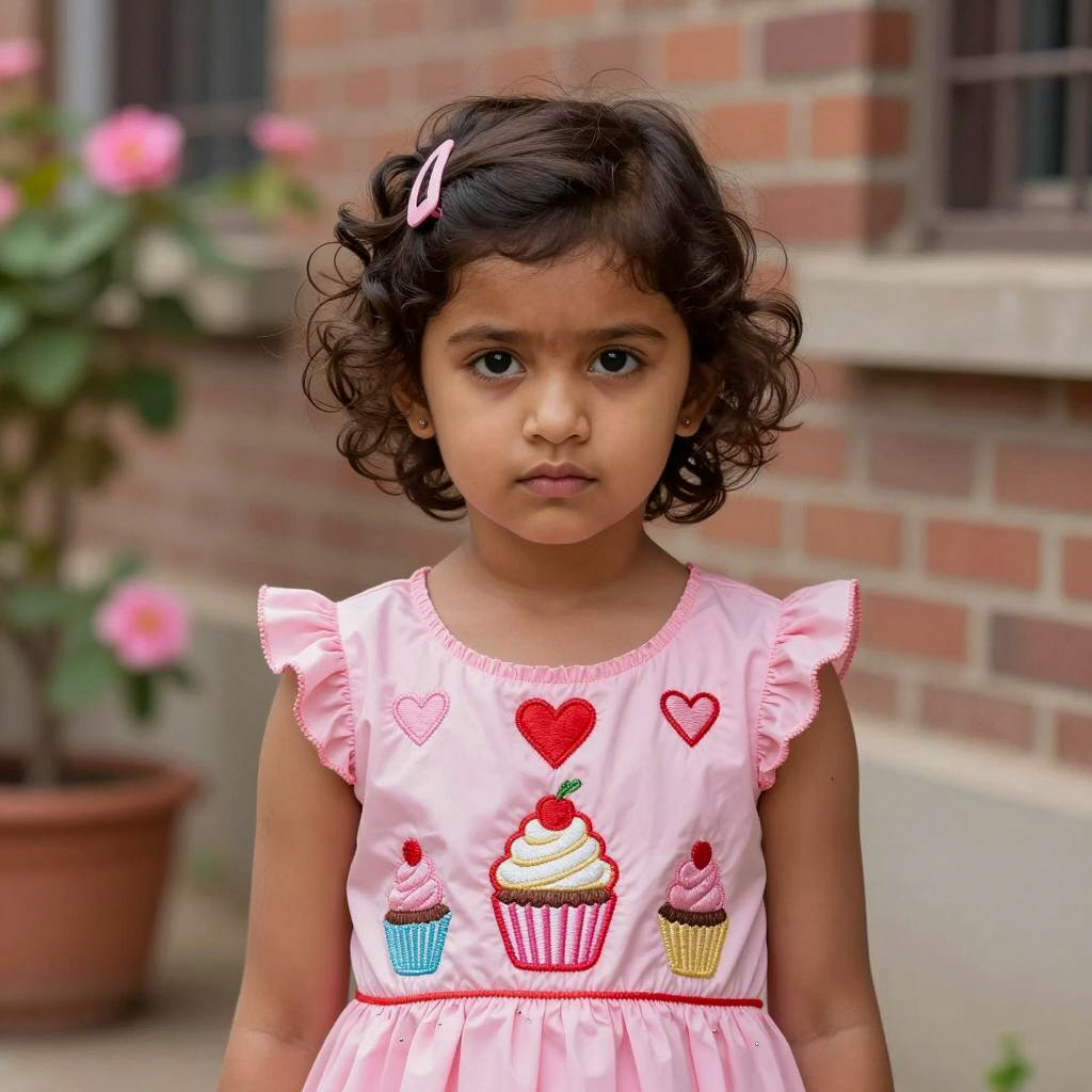 Cupcake pageant dress, photograph of young Indian girl, standing outdoors, daytime, brown skin, curly brown hair, pink hair clip, large brown eyes, serious expression, wearing pink sleeveless dress with ruffles, embroidered with hearts and cupcake design, small earrings, blurred background with brick wall and pink flowers, natural light, vibrant colors, childlike innocence, detailed ure on dress, close-up, centered, realistic style