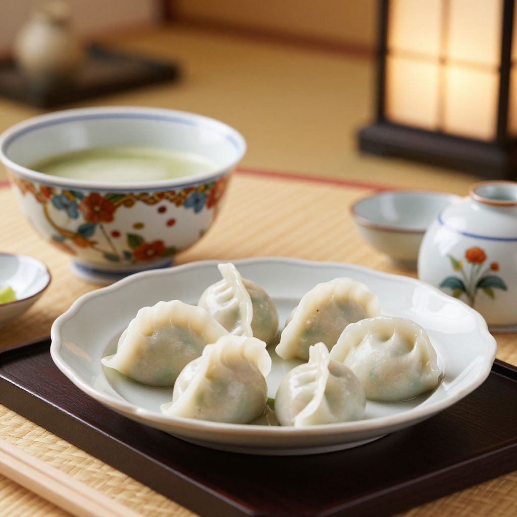 Photograph of a traditional Japanese setting featuring a white ceramic plate with five steamed dumplings in the foreground, placed on a black mat atop a tatami mat floor. In the background, a white bowl with colorful floral patterns is filled with green broth. To the right, a smaller white bowl with a similar floral design is partially visible. The scene is illuminated by soft, natural light from a lantern on the right. The overall color palette includes whites, greens, and earthy tones, creating a warm, inviting atmosphere.