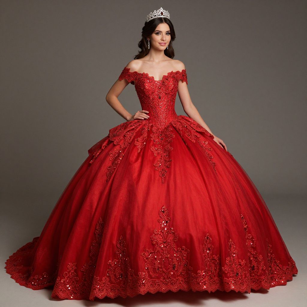 Photograph of a fair-skinned woman with long, dark brown hair, wearing a sparkling silver tiara. She is dressed in an off-the-shoulder, vibrant red ball gown with intricate lace detailing and a voluminous, flared skirt. The gown's bodice is fitted, accentuating her slender waist and modest bust. She stands against a plain, grey background, with one hand on her hip and the other resting on her skirt. Her expression is confident, and the lighting highlights the dress's rich, red color and delicate lacework.