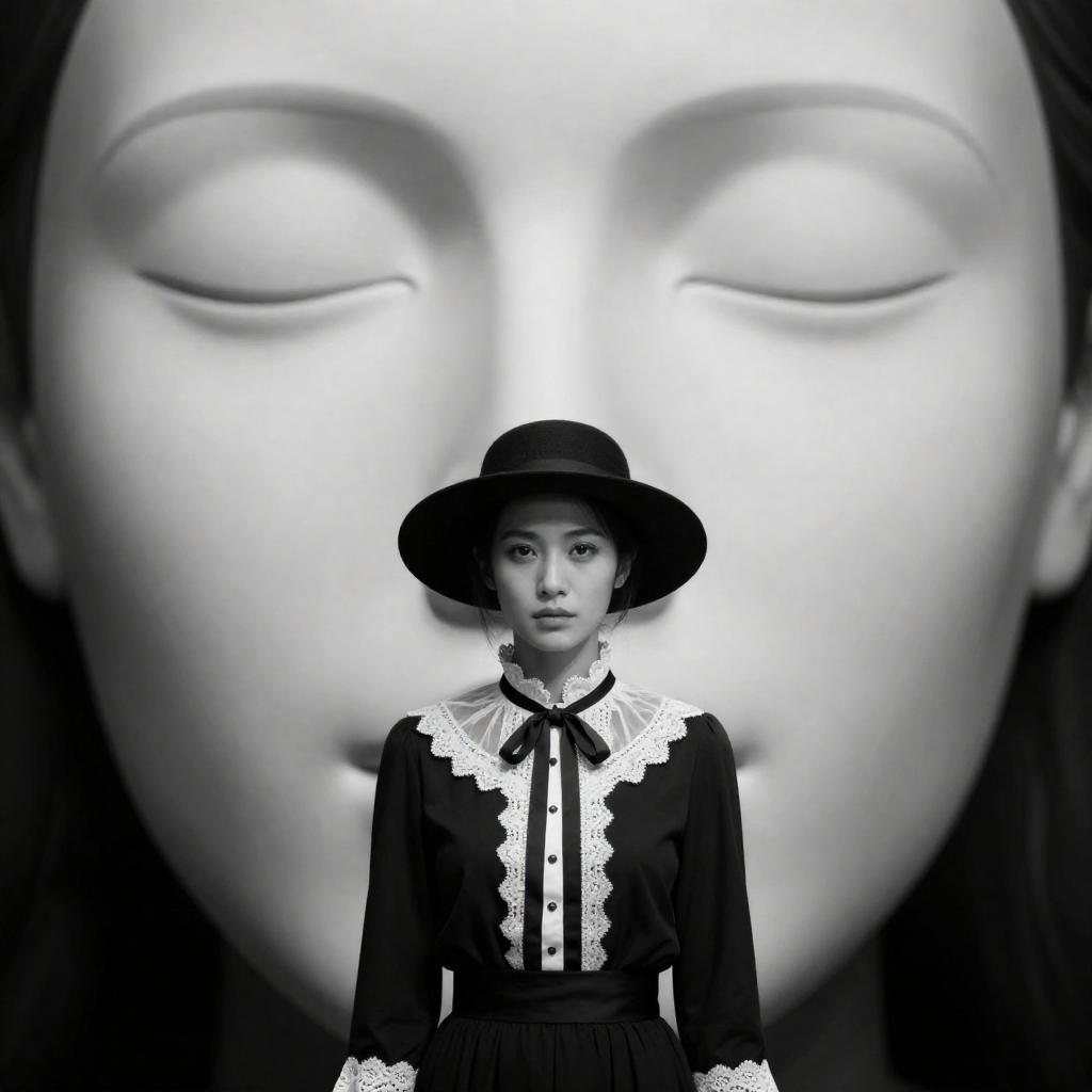 Photograph of a woman in a black outfit with white lace trim, black hat, standing in front of a large, monochromatic face with intense, closed eyes. Black and white background. One person. Intense facial expression.
