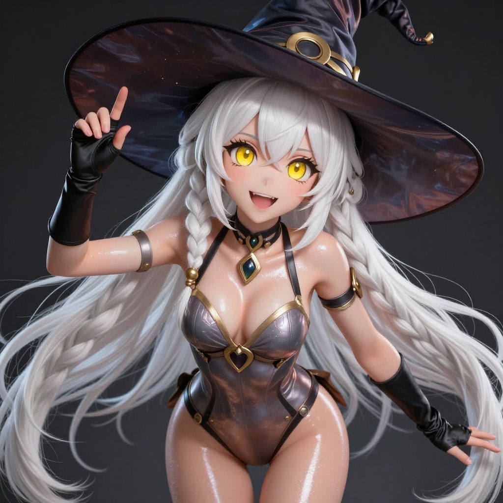 Hilda, yellow eyes, long hair, very long hair, braid, twin braids, white hair, hat, leotard, see-through, witch hat, fingerless gloves, jewelry, black gloves, (masterpiece:1.2), best quality, high resolution, unity 8k wallpaper, (illustration:0.8), (beautiful detailed eyes:1.6), extremely detailed face, perfect lighting, extremely detailed CG, (perfect hands, perfect anatomy), (masterpiece:1.1), (best quality:1.1), 1girl, Real light and shadow, 4k, 8k, wallpaper, epic, detail texture, (yellow eyes:1.5), ((((whitehair:1.35, medium hair)))), intricate eyes, beautiful detailed eyes, symmetrical eyes, big eyes:1.5, (((lustrous skin:1.5, bright skin: 1.5, skin tanned, shiny skin, very shiny skin, shiny body, plastic glitter skin, exaggerated shiny skin, illuminated skin))), (detailed body, (detailed face)), cute, erotic, daring, (dynamic pose:1.0), happy, smile, (centered, scale to fit dimensions, Rule of thirds), highres, sharp focus, (ultra detailed, extremely detailed), (photorealistic artwork:1.37), (extremely detailed CG unity 8k wallpaper), (((vibrant colors, vibrant theme))), (intricate), (masterpiece), (best quality), upper body, full body
