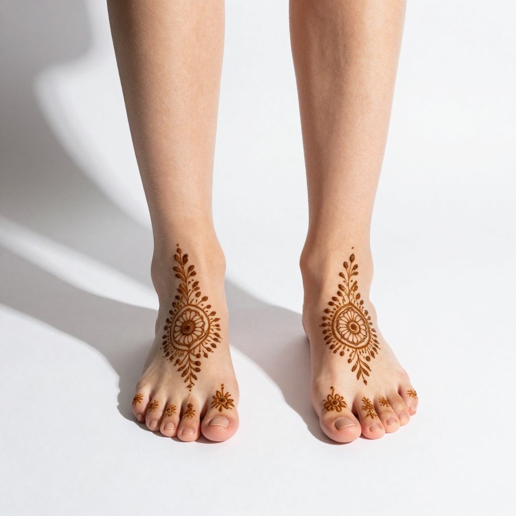 Photograph of a pair of light-skinned female feet standing on a white surface. The feet are adorned with intricate, dark brown henna designs, featuring floral and paisley patterns on the soles, toes, and around the ankles. The henna patterns are symmetrical and detailed, with a central flower motif on the soles and smaller designs extending to the toes. The skin is smooth, and the toenails are natural and unpolished. The background is entirely white, providing a stark contrast to the henna and the skin, highlighting the detailed henna work. The image is brightly lit, emphasizing the texture and color of the henna.