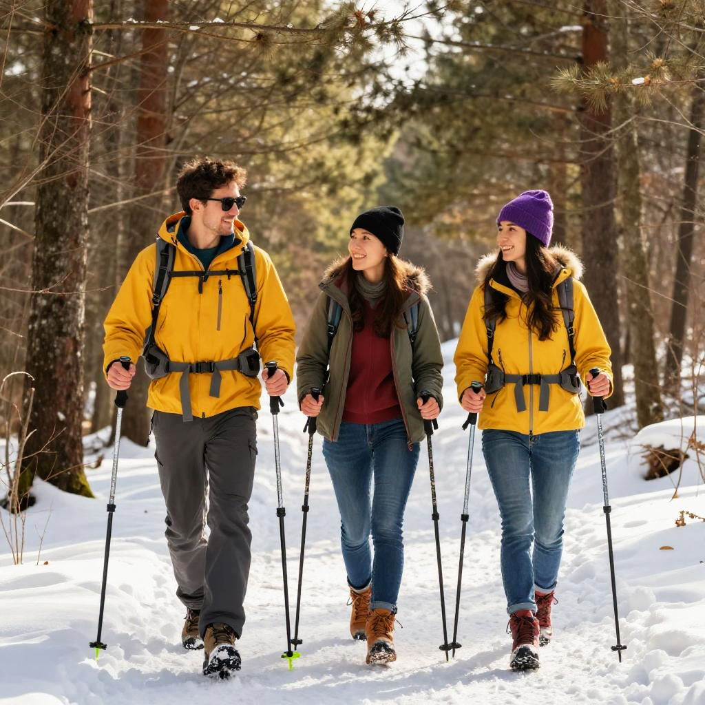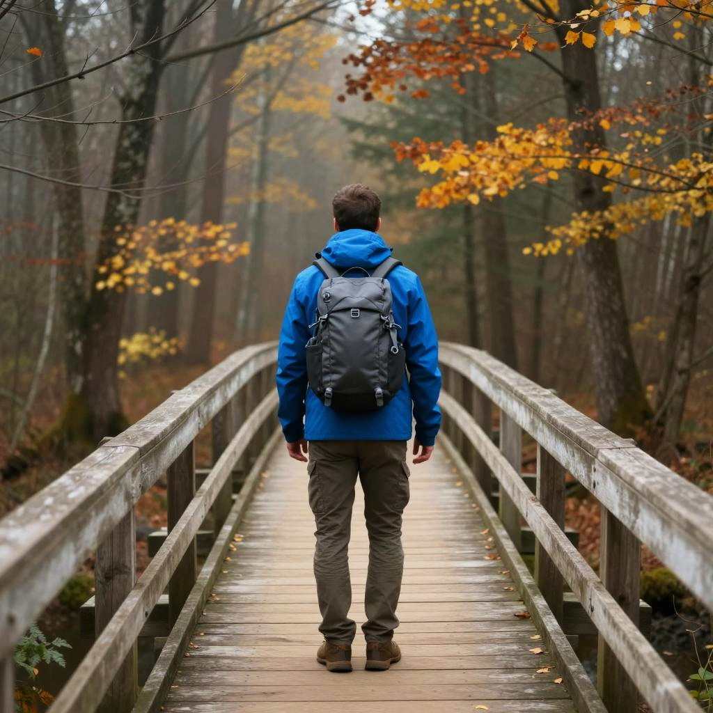 A man stands on a wooden bridge in a serene forest setting, surrounded by autumn foliage. He is wearing a blue jacket and a backpack, embodying an adventurous and outdoorsy lifestyle. The misty atmosphere adds a sense of tranquility and exploration to the scene.