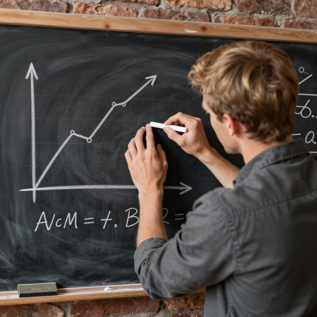 Man with blond hair, seen from behind, writing on a chalkboard with white chalk. He wears a dark gray shirt. Chalkboard has a graph, , and equations. Brick wall background. Man's right hand holds chalk, left hand supports it.
