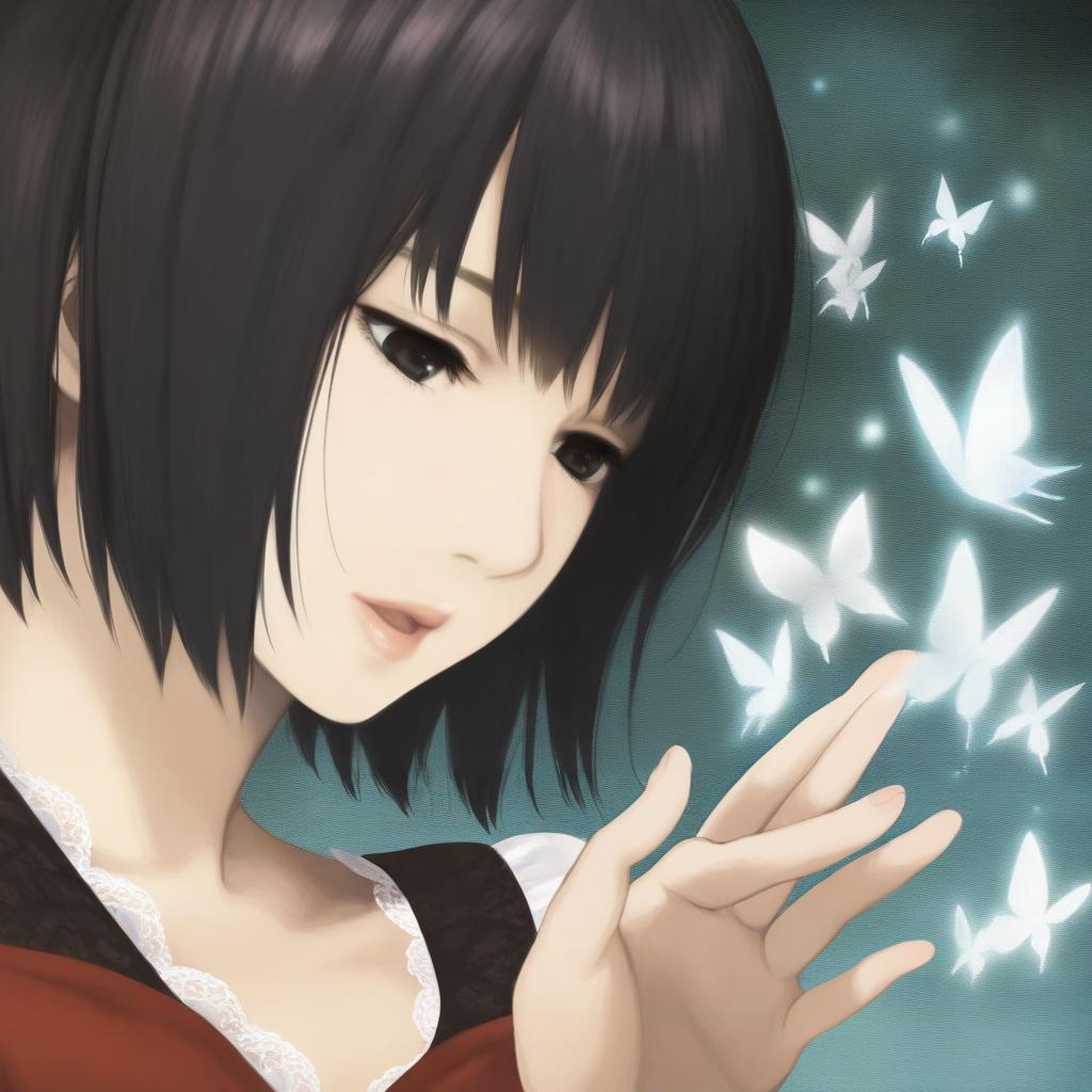 Amakura mio, fatal frame, 1girl, lips, brown eyes, short hair, black hair, brown hair, butterfly, by artist horiguchi yukiko, leet