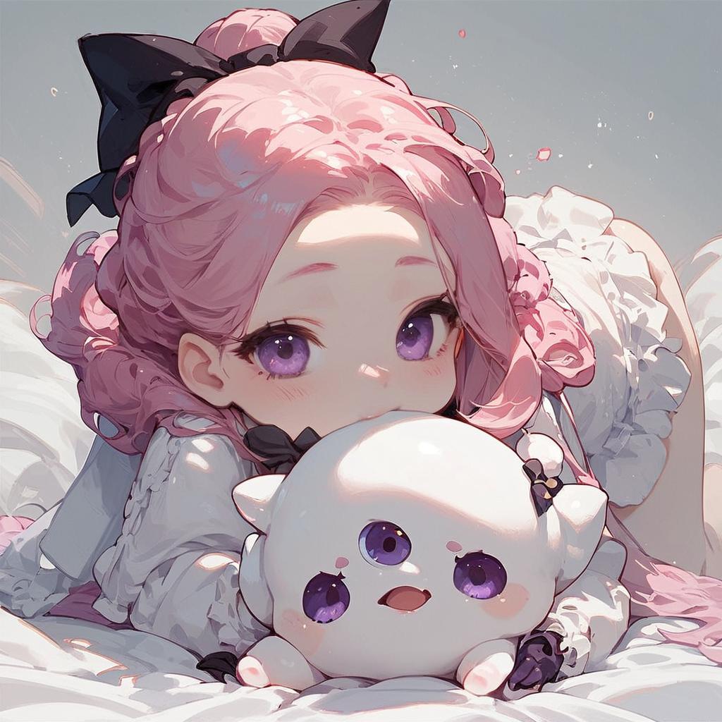 Digital anime-style artwork of a chibi character with pink hair tied in a bun with black bows, featuring large purple eyes and light skin. The character is lying down, holding a cute white creature with three purple eyes and a small black bow. The image has a soft color palette with detailed shading and highlights.