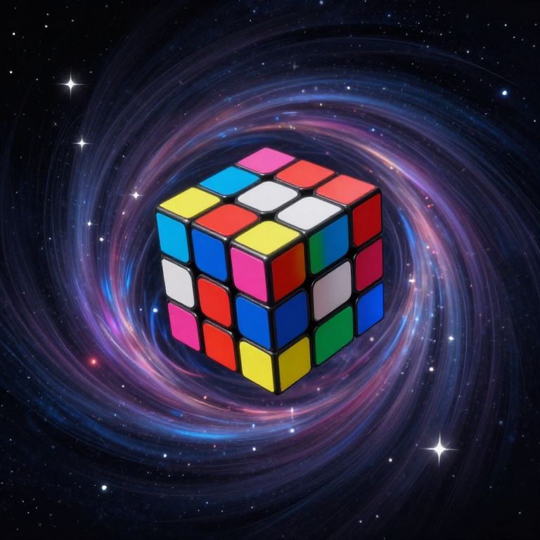 Amidst the cosmic dance of stars and shadows, a Rubik’s Cube of infinite possibility hovers at the edge of a swirling vortex, its vibrant colors pulsing with the rhythm of creation, inviting contemplation on the interplay of order and chaos, and the eternal quest for resolution.