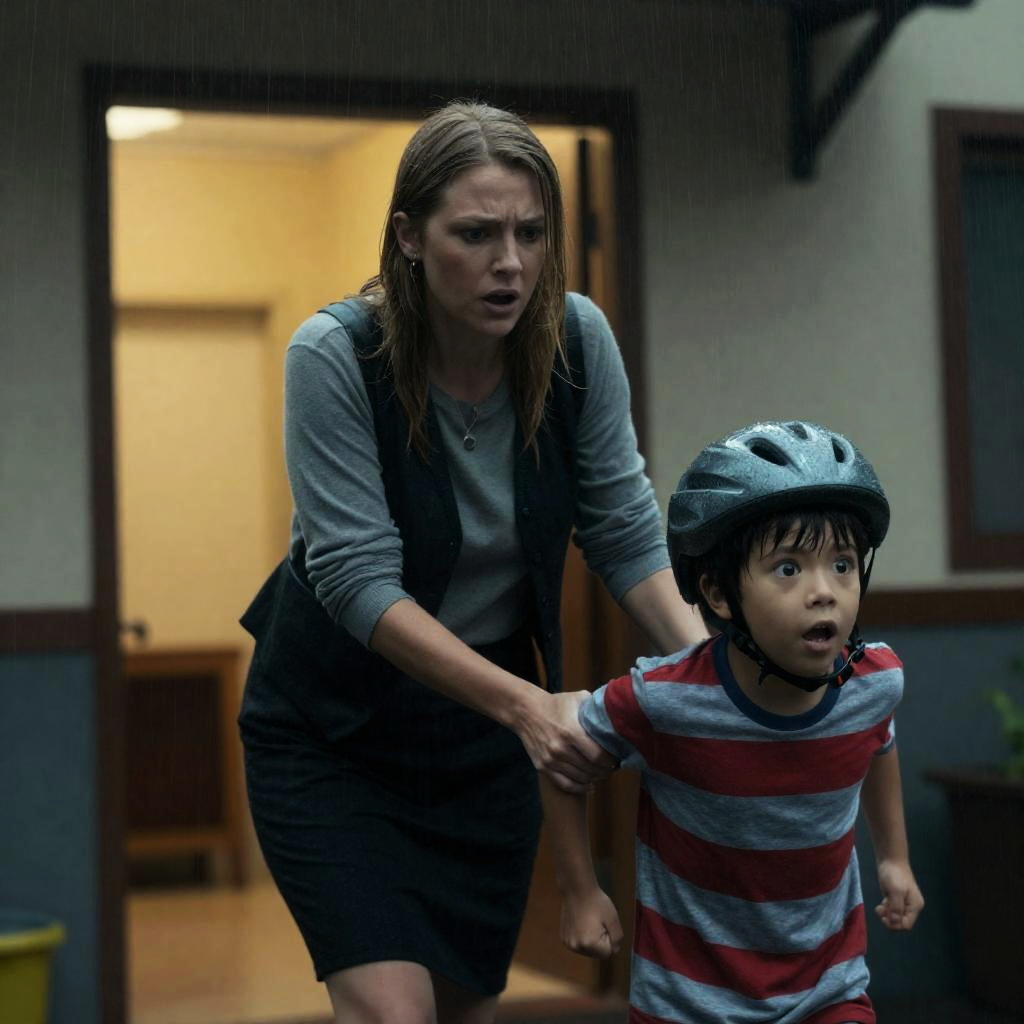 Photograph of a blonde woman with shoulder-length hair, wearing a yellow shirt, pushing a young boy with brown hair in a striped shirt and jeans, who is sitting in a metal cage. Behind them, a building with a red roof is engulfed in bright orange flames. The background includes a street, trees, and power lines. The boy looks forward, while the woman looks intently at the camera.