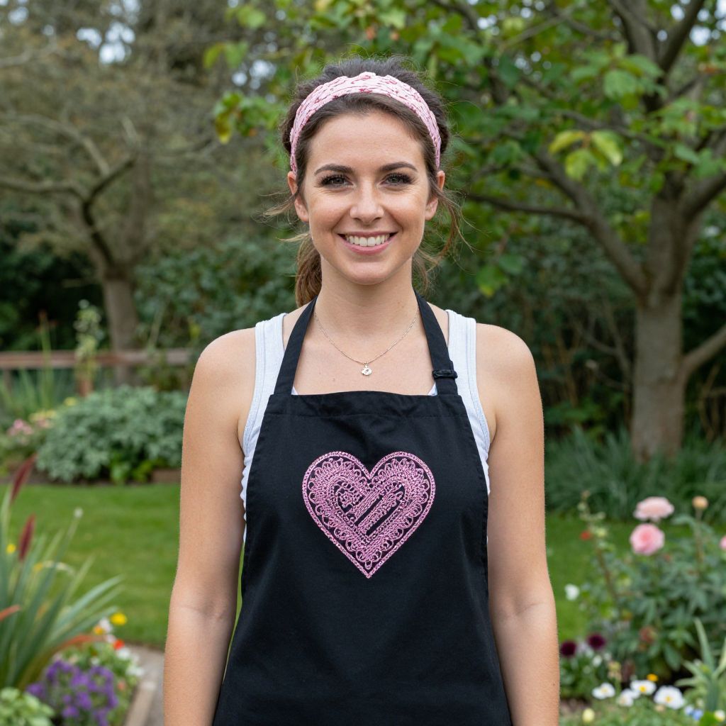 Smiling woman wearing a pink floral headband and a black apron with a pink heart design stands outdoors in a Secret Garden in Kent, surrounded by lush green trees and grass.