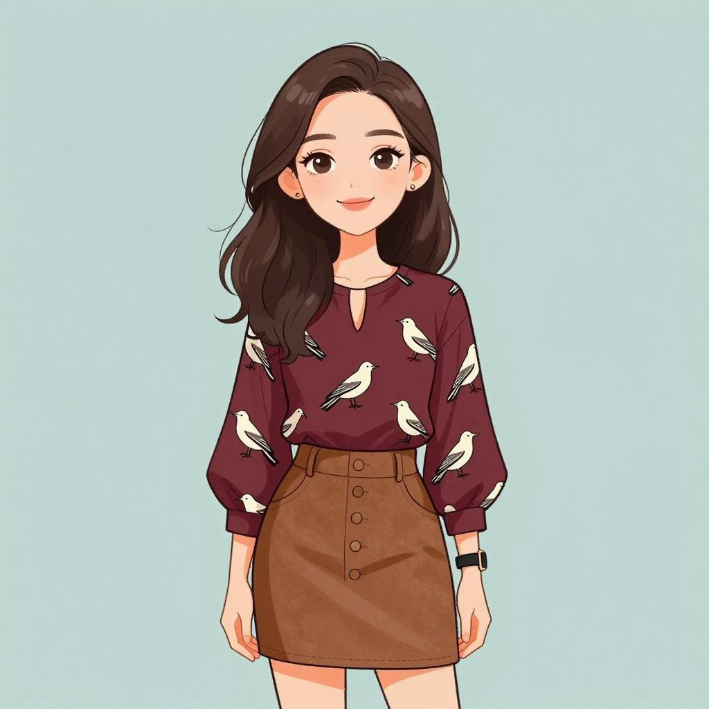 Digital anime-style illustration of a smiling woman with long black hair, wearing a maroon bird-patterned top and brown buttoned skirt, against a light