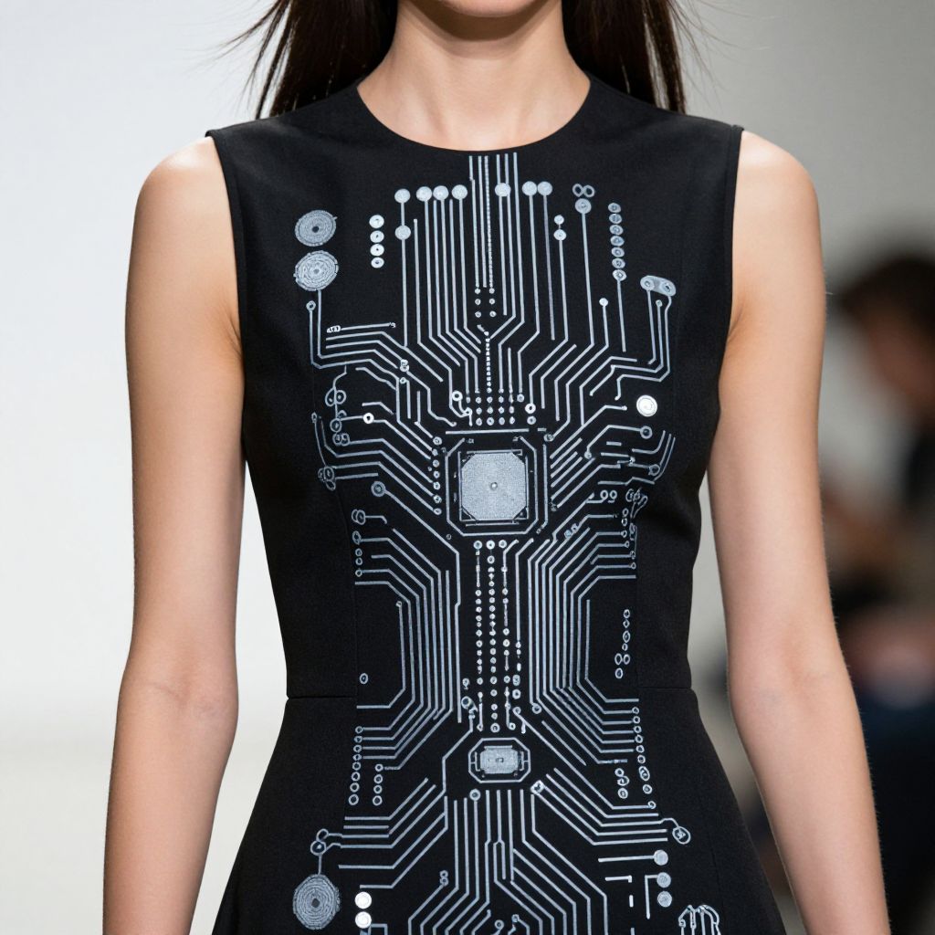 Close up of female fashion model in, model wearing an edgy black dress with print of a large circuit on dress, photography , fashion magazine editorial , highly detailed