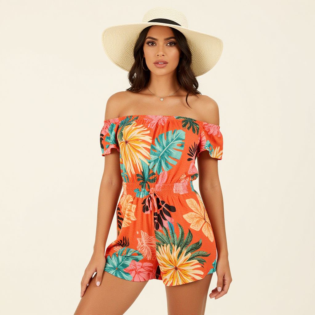 A stylish woman in a vibrant floral romper poses with confidence against a light background, showcasing her summer fashion. Her off-the-shoulder design and wide-brimmed hat perfectly complement the tropical theme, making it an ideal choice for warm weather outings.