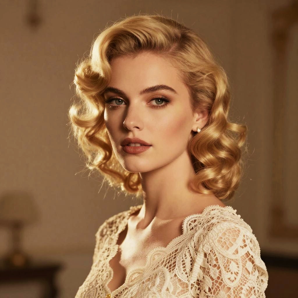 Blonde filter effect on an elegant vintage fashion portrait, model with blonde wavy hair styled in soft curls, warm sepia tones blending with golden highlights, intricate lace outfit, classic beauty emphasized by soft focus and glowing ambiance.