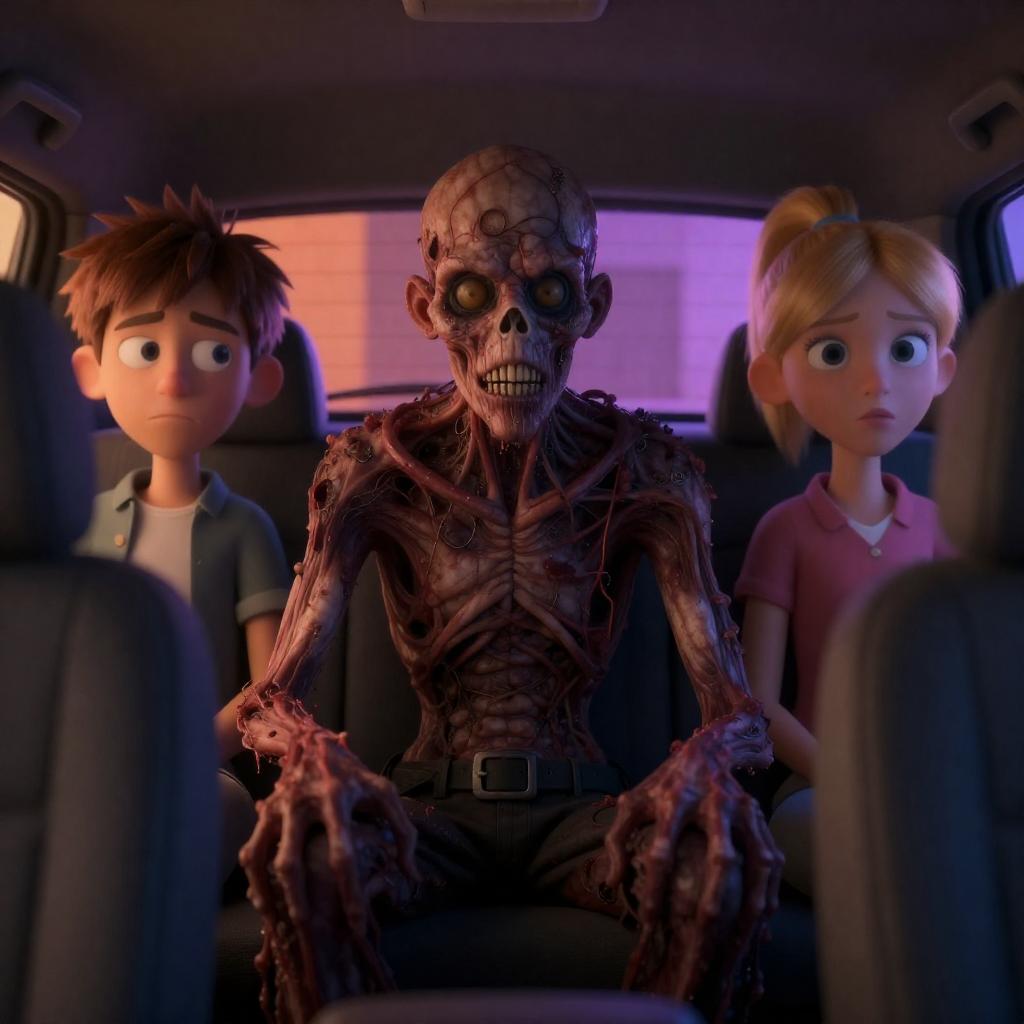 Man in gray suit with large belly, holding gun, aiming at green, grotesque, zombie-like creatures on left. Dark purple night sky, streetlamp, house with yellow siding in background. Another person's red fist in foreground on right.