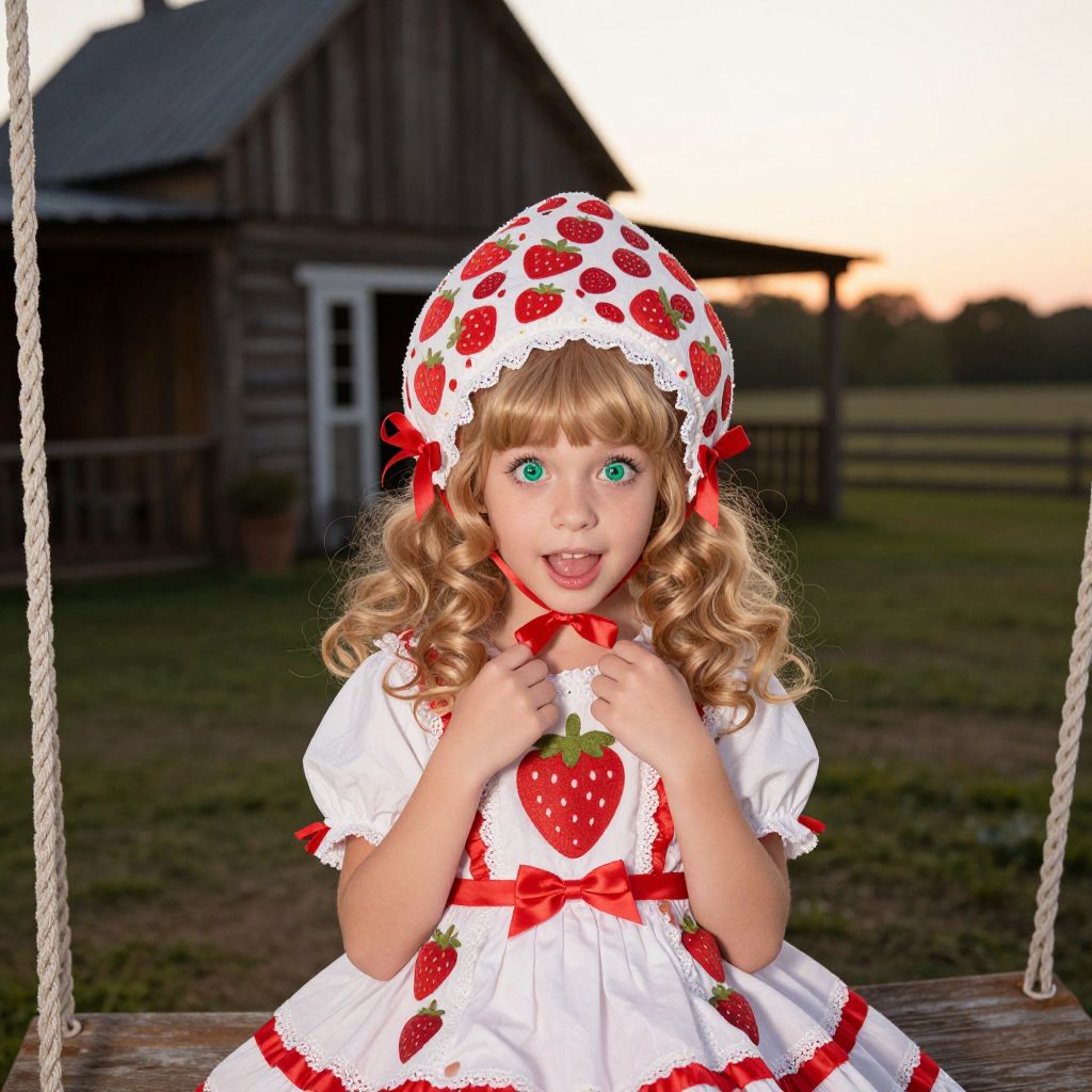Photograph of a young girl with curly blonde hair, wearing a white dress and strawberry-patterned bonnet adorned with red ribbons. Her green eyes are wide, and she has an open-mouthed, surprised expression. The dress features red strawberry accents, a red bow, and puffed sleeves. She sits on a wooden swing with white ropes, set against a rural backdrop of a wooden barn and a sunset sky. The grassy field and wooden fence add to the rustic setting. The image has a slight digital enhancement, making colors more vivid.