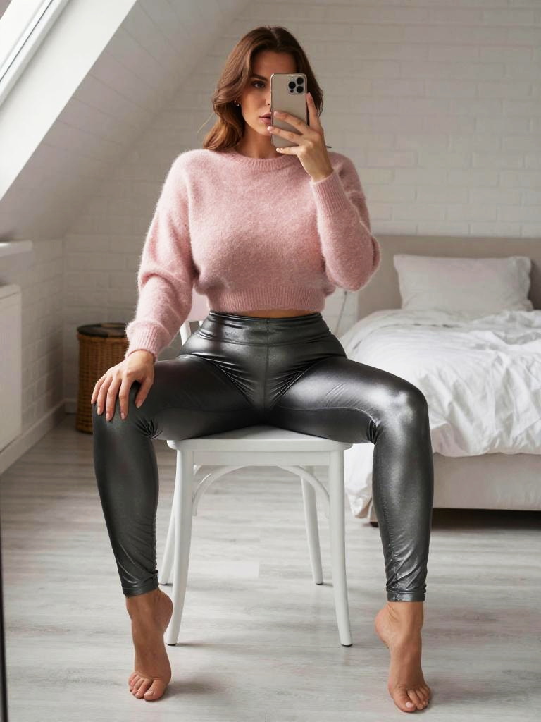 Woman wearing shiny leggings, massive breasts, tall woman with chestnut hair and neutral beige skin taking a mirror selfie, wearing soft cashmere-like cropped sweater in soft lavender paired with ultra-glossy midnight navy leggings, cozy socks on her feet, seated on a white chair with legs angled toward the camera and phone held up in one hand, cozy attic bedroom interior with small vanity table and mirror, fashion social-media style photo, high resolution, soft natural light from a nearby window