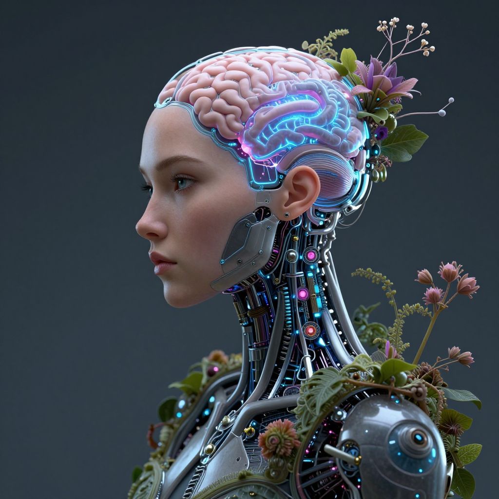 A highly detailed, cyberpunk-inspired image of a woman with intricate biomechanical and botanical elements, featuring electronic brain, neural network, and bioluminescence.
