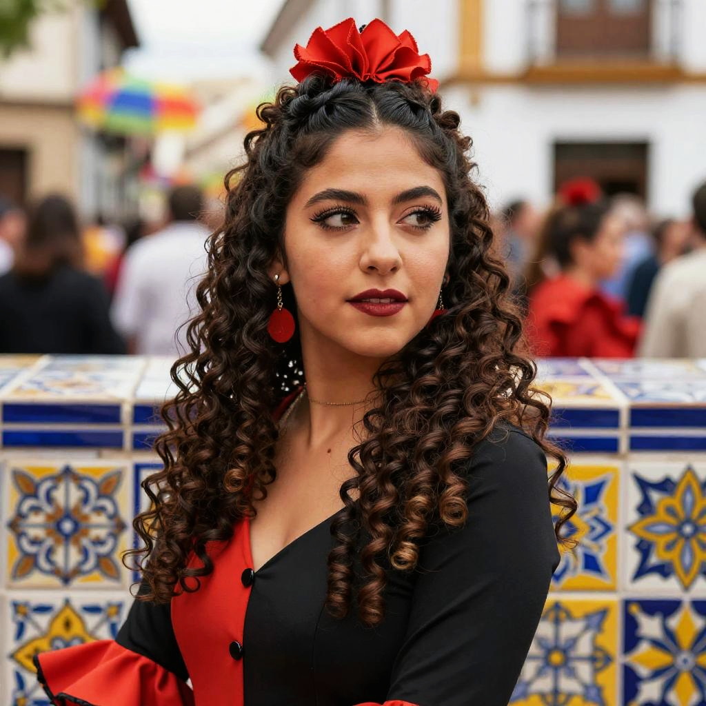 Portrait of a pretty Spanish girl with dark curly hair and olive skin, dressed in traditional flamenco attire, expressive eyes, surrounded by colorful Spanish tiles and lively street festival background