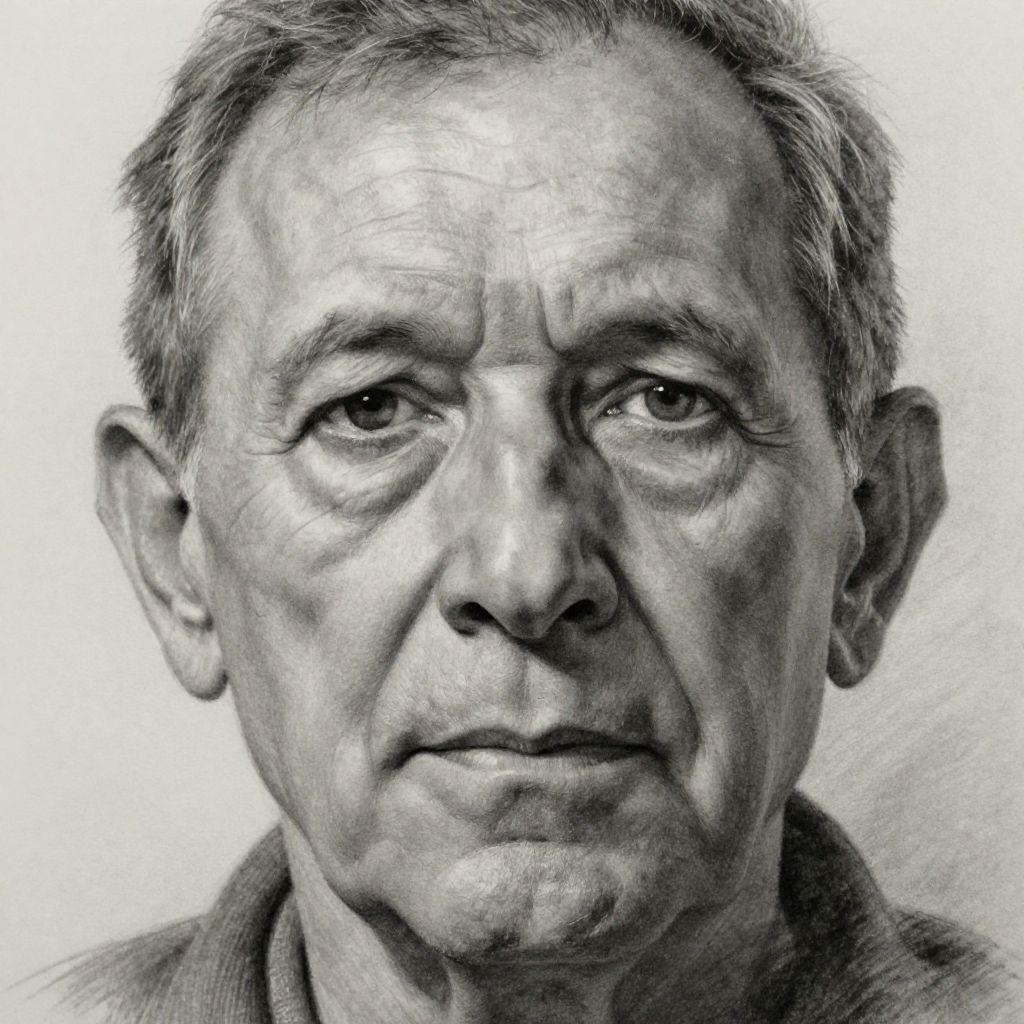 Monochromatic pencil drawing of an elderly man with short, graying hair, wrinkled skin, and a solemn expression, against a plain white background
