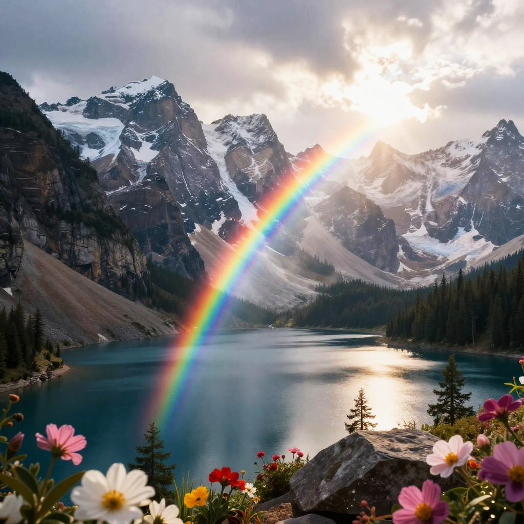 A rainbow over a mountain lake surrounded by snow capped peaks, Chromatic, Comic Book, Floral, ambient light, backlight masterpiece, realistic, award winning, volumetric light and fog, subsurface scattering, caustics, bloom, perfect exposure, perfect composition, rule of thirds, 8k, hdr10, cinematic, breathtaking
