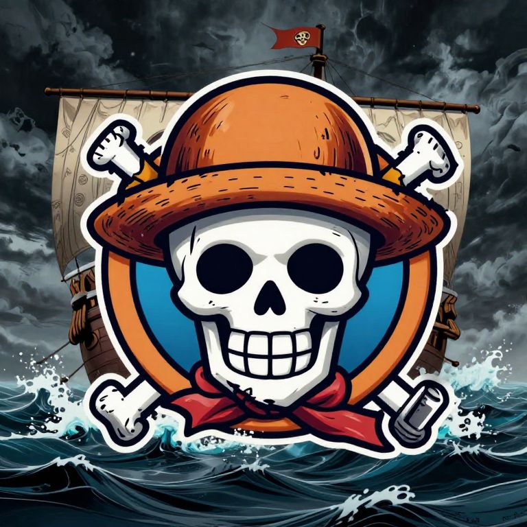 One Piece logo generator artwork, fantasy pirate emblem showcasing a straw hat perched on a skull, surrounded by swirling sea waves and ship elements, vibrant reds and blues, dynamic lighting effects, ink sketch style merged with digital color splash